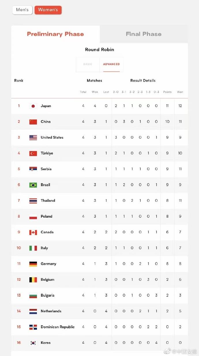 而中国女排则在首阶段连胜荷兰、土耳其、意大利三支实力不俗的球队,只可惜最后惜败泰国队,没能拿下4战全胜的完美开局。