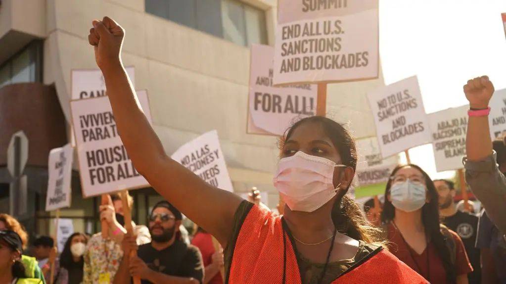▲6月10日,民众在美国加利福尼亚州洛杉矶举行游行,抗议美国的外交政策。新华社发 会场内,美国的排他性政策引发众怒,“成就”了历届美洲峰会上领导人出席率的最低记录,不少与会者直言“参加峰会就是为了把抗议的声音带到会场”。 会场外,上千名示威者高呼口号,反对美国政府对古巴等拉美国家的制裁,拉美各国网友更是在海外社交媒体上火力全开,花式吐槽美国,观点犀利火辣。