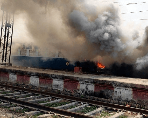 当地时间16日,印度恰普拉,抗议者点燃了一节火车车厢。