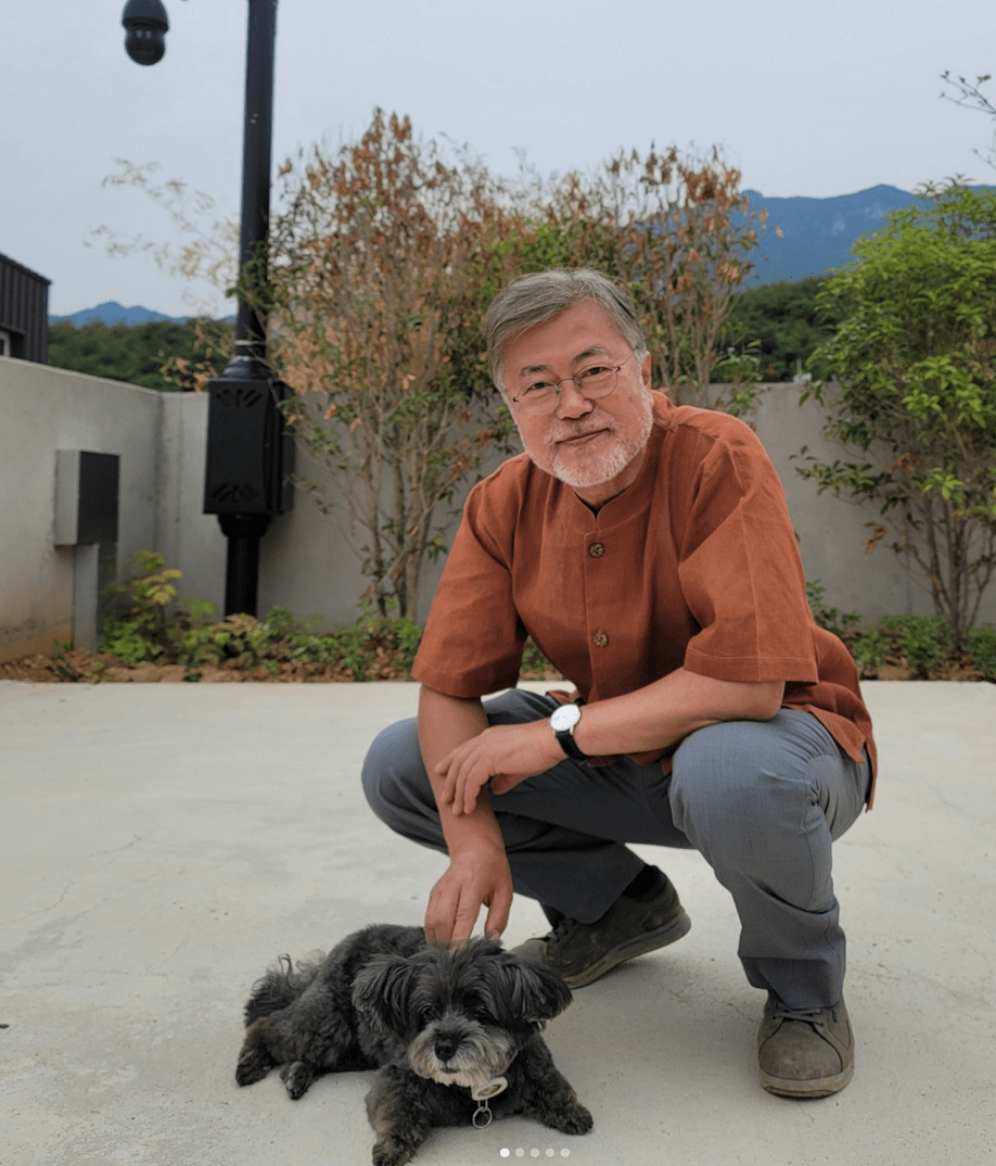 文在寅与宠物狗的合影(社交平台) 照片显示,文在寅在地里弯腰采摘生菜,69岁的他胡子全白,白发也显著增多。他与客人座谈时,身边有猫狗相伴。