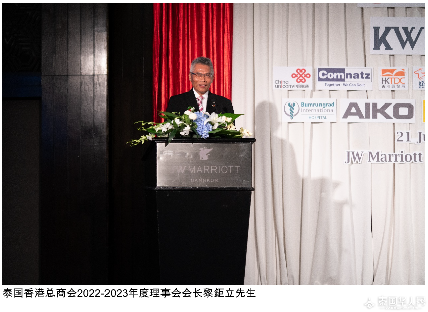 中华人民共和国驻泰王国大使馆商务公参王立平先生在致辞表示,中泰是好邻居、好伙伴、好亲戚,两国高度互补。在两国共同努力下,中泰全面战略合作伙伴关系不断深化发展,高质量共建「一带一路」不断推进,经贸合作取得丰硕成果。香港是中国的东方明珠,也是中国对外开放的重要门户。随着粤港澳大湾区建设和共建「一带一路」,港资企业可充分发挥投资泰国的独特优势,推动双方合作。商务公参王立平先生代表中国大使馆对新一届理事会表示祝贺,并对泰国香港总商会为促进中港经贸合作做出的努力和贡献表示感谢。 香港驻曼谷经济贸易办事处处长李湘原先生在致辞中提到,香港一直是国际商业城市、金融中心和物流枢纽。2022年是香港特别行政区成立25周年,庆祝主题是「砥砺奋进廿五载,携手再上新征程」,这彰显了香港对更美好未来的期待和信心。香港作为中国的特别行政区,与中国内地市场紧密联系,香港是企业进驻中国内地市场和大湾区的绝佳选择。泰国香港总商会一直是香港经济贸易办事处在加强香港与泰国的联系与合作方面的密切伙伴,双方将继续携手提升香港与泰国的双边关系,共同探索更多在大湾区前所未有的机会。 泰国中华总商会主席林楚钦先生对新理事会就职热烈祝贺,并赞扬泰国香港总商会精英荟萃,自成立以来全体精诚团结,会务蓬勃发展,为泰港两地经贸关系的不断深化,为泰港两地多领域的友好合作,起了积极的推动作用,为泰国的经济繁荣做出了杰出贡献。 香港贸易发展局东南亚及南亚首席代表黄天伟先生简介了一系列当局近期举办的商务推广活动,并重点邀请与会嘉宾参加8月31日至9月1日举行的「一带一路高峰论坛」,探索各项倡议,交流在粤港澳大湾区及区域全面经济伙伴协议等带来的商机。黄天伟代表又感谢泰国香港总商会多年来的紧密合作与相互支持,期望双方继续紧密合作,共同推动香港与泰国的经贸关系。 活动上,泰国香港总商会预吿今年将举办多项大型活动,包括 7月的香港特别行政区成立25周年活动、11月的商会30周年纪念活动等,并诚邀各界贵宾的鼎力支持。典礼圆满举行,标志上届会长余永年先生功成身退,荣升名誉顾问;上届副会长陈锦华先生亦届满卸任;新任会长黎巨立先生正式接棒并致辞感谢贵宾及各界代表莅临,承诺将努力不懈带领商会新届理事会薪火传承,推陈出新,再创辉煌,继续为会员服务,推动中泰之间的商贸合作,促进经济发展及社会繁荣安定。