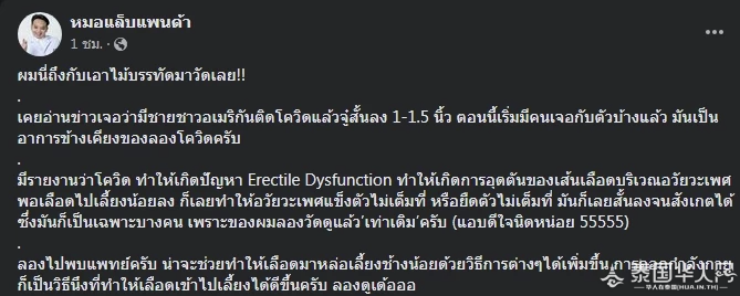 近日,一个泰国医学博主在其脸书中公布有网友咨询他关于感染新冠后,怀疑自己生殖器变短的聊天截图,在泰国网络上引起轩然大波。