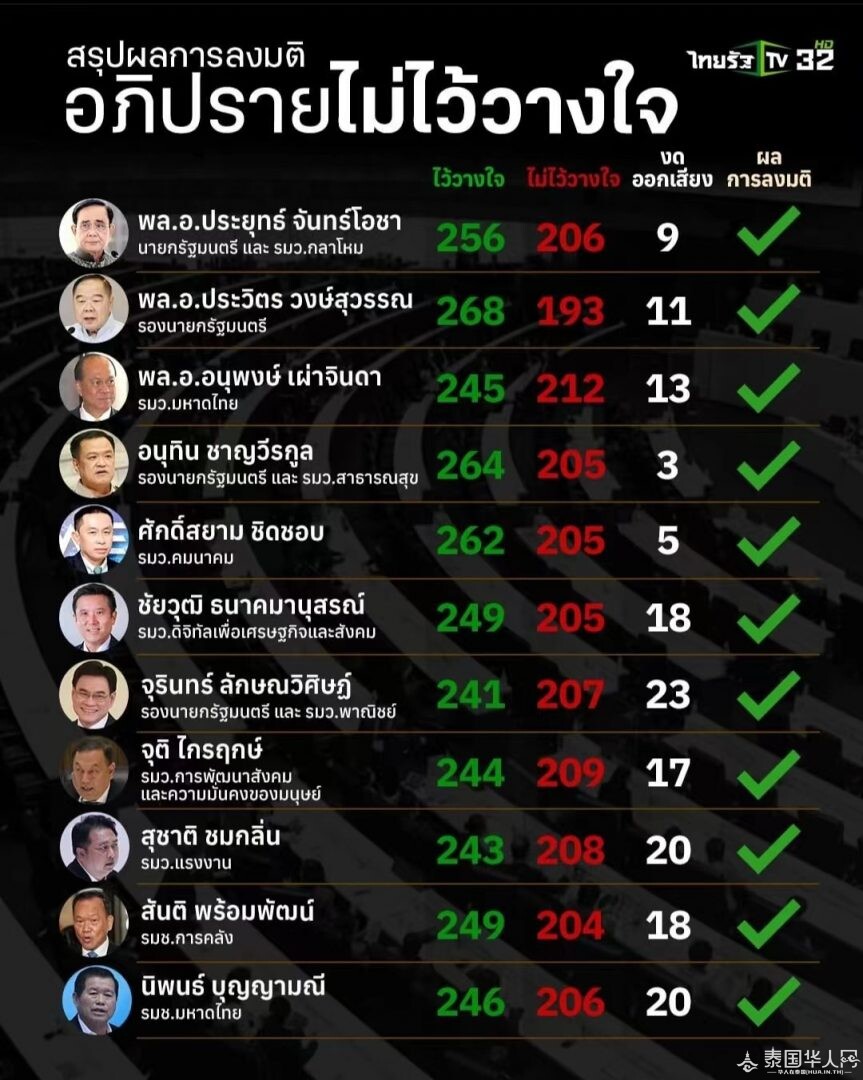 泰国华人网讯 7月23日,据泰媒报道,泰国国会在经过连续三日的不信任辩论动议会后,对包括巴育在内的11名内阁成员的不信任动议案作投票表决,全员信任票数过半、得以继续任职。其中获信任票最多的为泰国泰国副总理巴 ...
