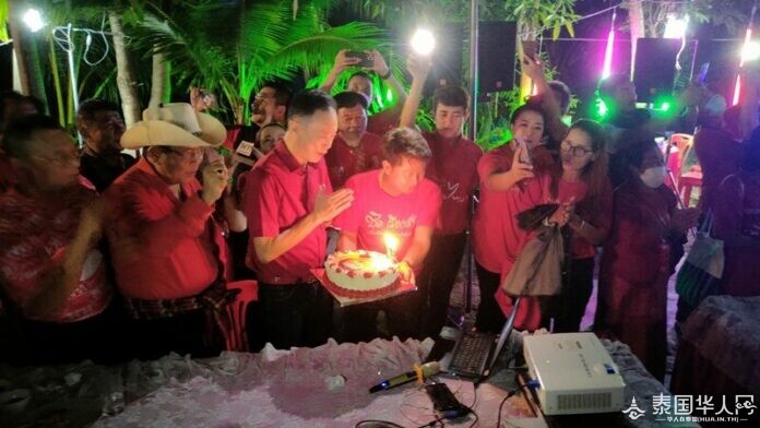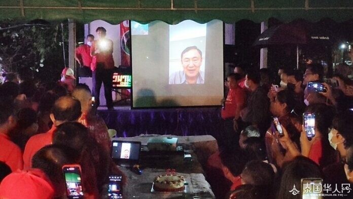 泰国华人网讯 7月23日晚,在泰国东北部呵叻府,由东北红衫军主席帕亚和阿努瓦组织了东北部20个府的红衫军共同聚餐,以庆祝7月26日为泰家族73周岁的生日。 宴会上,前总理他信惊喜线上给为泰家族送祝福,与在场的所有人同庆即将到来的为泰家族73周岁的生日。