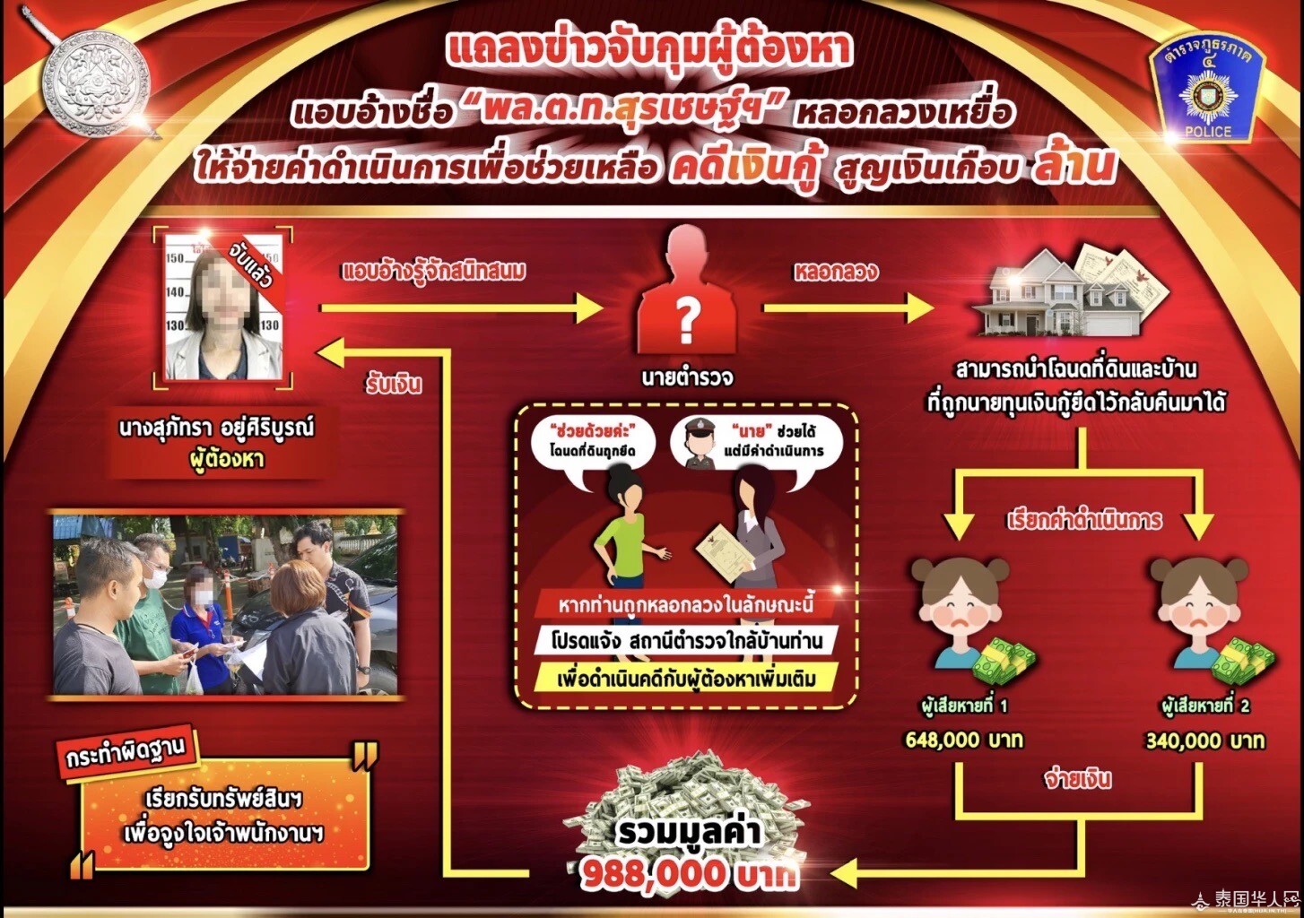 泰国华人网讯 据泰媒报道 泰国一女子冒称可帮助贷款受害者搭线现任国家警察总署助理署长素拉切,以获得警方帮助从而追回被骗贷款,向他人实施诈骗近100万泰铢。目前,该行骗女子已被逮捕。 此前,有两名受害人向黎府Pak Chom警察局报案,称其在2019年与嫌疑人Supatra相识,Supatra谎称能将受害人引荐给时任打击非正规贷款队负责人的素拉切警中将,让二人能寻求素拉切帮助以拿回此前委托非正规贷款团队出售而被骗走的土地钱财,代价要求两人支付手续费,金额约100万泰铢。 接到受害人报案后,黎府警方立即展开调查并逮捕令Suphatra。经调查发现,Suphattra此前也曾因非法贷款组织被骗,但经过素拉切的办案调查后得以追回钱财,然而这之后却假借素拉切警中将名号欺骗他人,导致许多民众受骗,至目前共有2名受害者报案。 素拉切对此表示,他保证自己没有涉案或在此前知晓与本案的任何信息。并建议民众,如果被非正规贷款团队侵占财产或土地需要寻求帮助,可以向1599热线提出投诉,或在全国任何当地警察局报案。他还强调自己没有以任何方式寻求非法利益,如果再发现有人冒用其身份行骗,将对所有违法者追求法律责任到底。 (编译:黄莹莹 四点零翻译工作坊;审校: hush ;来源:komchadluek)
