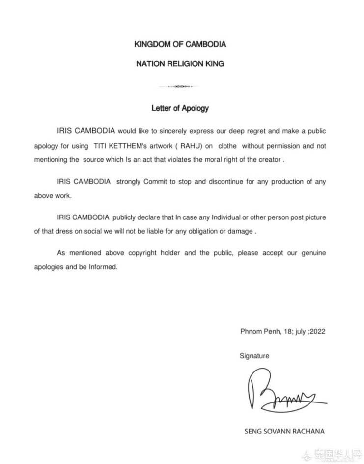 近日,涉事的柬埔寨服装店发布声明,公开向泰国和作品设计师道歉,并承诺会停止所有侵犯版权和有损泰国设计师的行为。