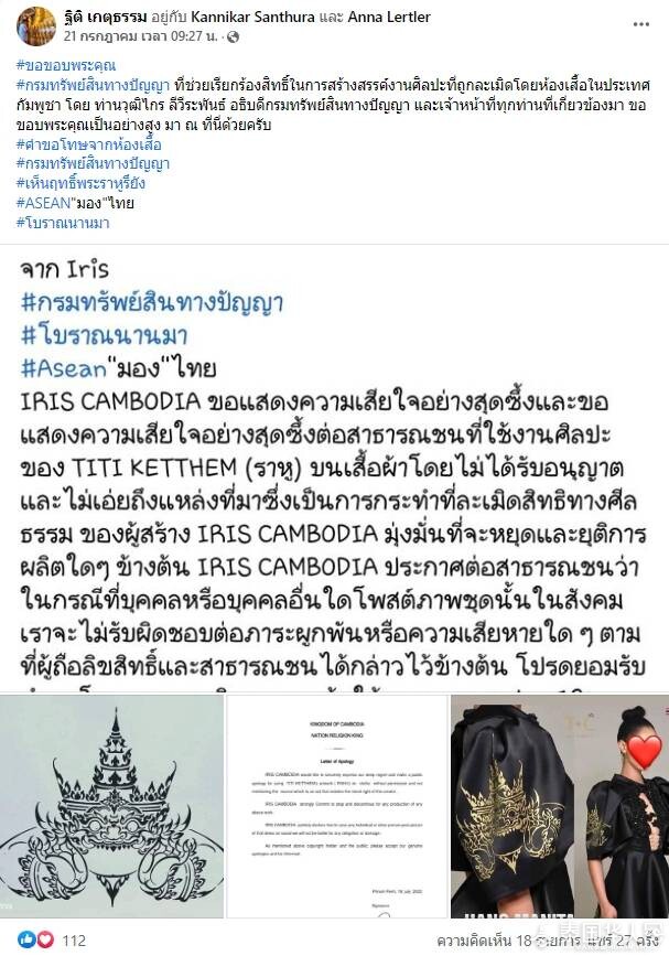 被侵权的泰国设计师Thiti Ketthum 也发文称,感谢知识产权局提供援助和积极行动,迅速对柬埔寨的盗版问题进行追究,这不仅维护了泰国设计师的合法权益,同时有助于促进泰国的创意产业强劲增长。