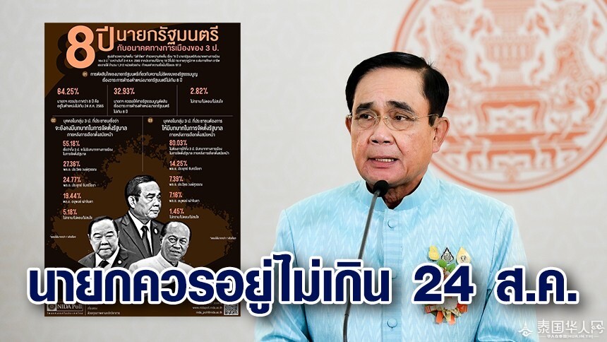 泰国华人网讯  8月7日,据泰媒报道,泰国国立发展管理研究所(NIDA)民意调查中心公布了一项调查结果。该调查在2022年8月2日至4日期间,对18岁及以上的公民进行关于“总理任职8年和解读以巴育总理为首的三位领导人政治前途”的民意调查,调查样本单位覆盖泰国各个地区,共计1,312个。