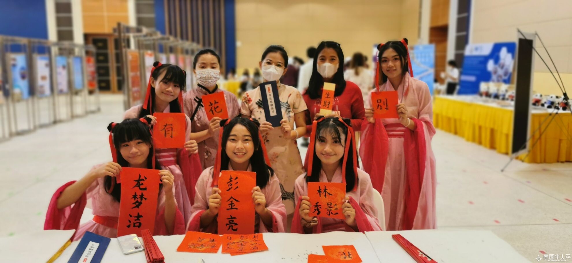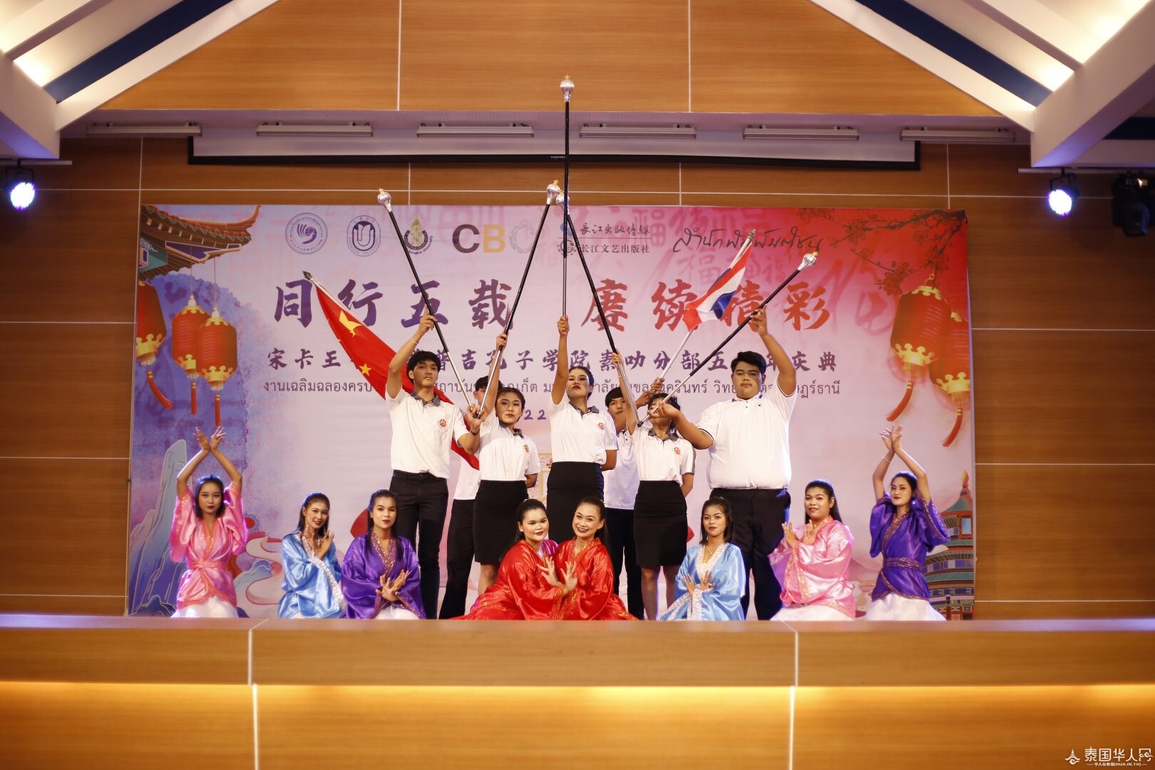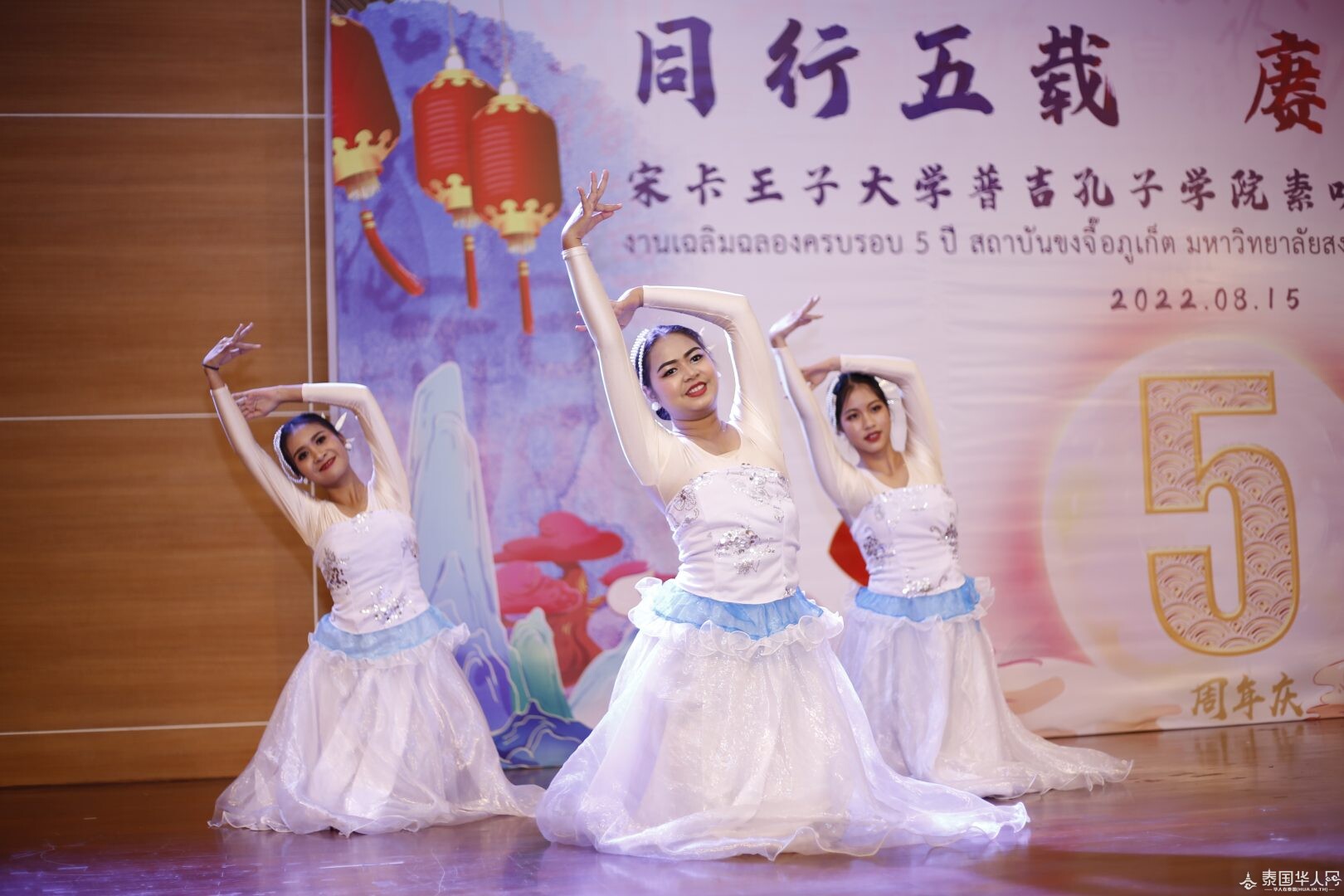在中华文化体验展区,普吉孔院素叻分部为观展师生安排了丰富多彩的中华文化体验活动,包括中国书法、国画团扇、古筝表演、雕版印刷、五子棋和毽子等中华传统文化项目,引得泰可爱们纷纷体验。 五周年庆典文艺汇演以一部三分钟的普吉孔院素叻分部视频回顾拉开帷幕,帧帧幕幕浓缩着孔院人五年来的辛苦付出,声声祝福表达了对普吉孔院素叻分部的美好祝愿。随后来自10所学校的泰可爱为现场观众奉献了13个多姿多彩的节目,婉转悠扬的中国歌曲与曼妙多姿的中泰舞蹈相得益彰,异彩纷呈。