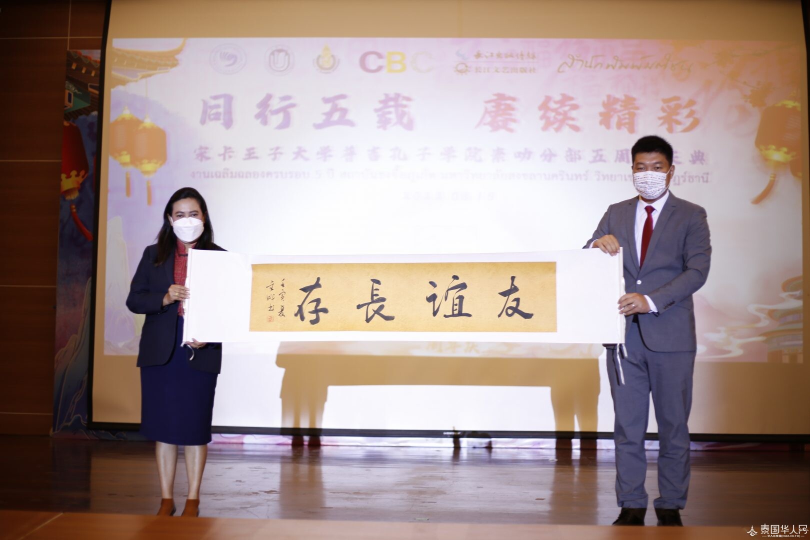 2022年8月15日,宋卡王子大学普吉孔子学院素叻分部5周年庆典在宋卡王子大学素叻校区大礼堂隆重举行,来自13所学校的400余位师生齐聚线下,共庆盛典。泰国前副总理素贴(Suthep Thaugsuban)先生、宋卡王子大学素叻校区副校长苏查达(Suchada Thipmontri)副教授、宋卡王子大学普吉孔子学院中方院长杨文波副教授等领导嘉宾线下出席庆典并致辞,上海大学副书记欧阳华教授线上致辞恭贺普吉孔院素叻分部五周年盛典隆重举行。本次庆典由宋卡王子大学普吉孔子学院素叻分部主办,长江文艺出版社、麦迪逊出版社(Matichon Publishing House)、宋卡王子大学素叻校区国际学院汉语商务交际专业协办。