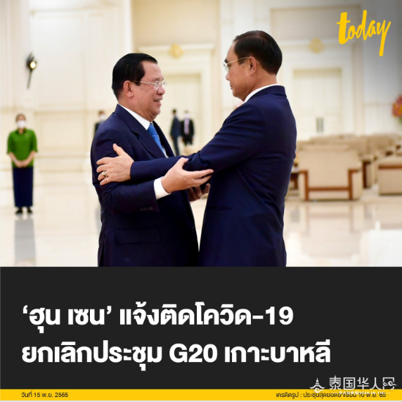 泰国华人网讯 11月15日,据泰媒报道,柬埔寨首相洪森在脸书上发布声明,称由于自己确诊新冠,因此取消参加G20峰会。洪森原定在G20峰会上与法国总统马克龙和中国国家主席习近平会面。但由于洪森比较晚抵达巴厘岛,所 ...