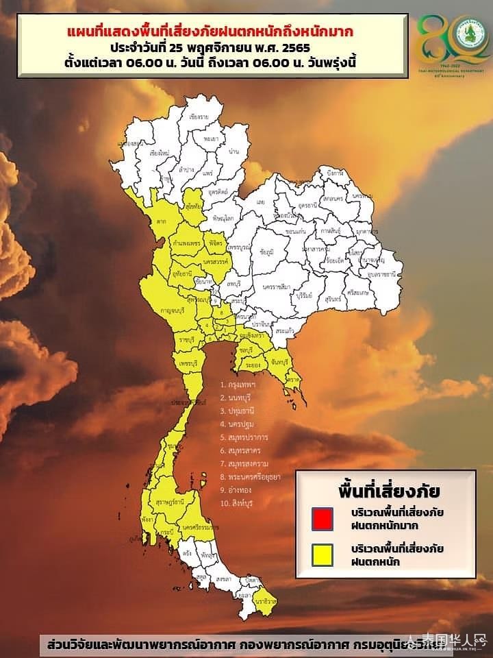 泰国华人网讯 11月25日,气象部门报道,由于冷空气已覆盖安达曼海上游,将有暴雨席卷泰国各部各府和季风横跨南部地区,季风已覆盖泰国北部、东北部、中部地区。 目前将会迎来暴雨,导致淹水、涝灾、洪水等问题,尤其是靠近海边和一些低地区域,气象部提醒出行的人们注意安全。 降雨地区: 北部:以下地区60%将迎来雷暴雨 达府、素可泰府、甘烹碧府和披集府 最低温度21-24摄氏度 最高温度28-31摄氏度 东北部:以下地区40%将迎来雷暴雨 黎府、廊开府、汶干府、农布林富府、乌隆他尼府、孔敬府、猜也奔府、呵叻府、武里南府和素林府 最低温度22-25摄氏度 最高温度29-33摄氏度 中部:以下地区70%迎来雷暴雨和局部暴雨 那空沙旺、乌泰他尼、大城府、素攀武里、北碧府、叻武里府、佛统府、夜功府和夜功府 最低温度23-25摄氏度 最高温度27-32摄氏度 东部:以下地区70%迎来雷暴雨和局部暴雨 北柳府、春武里府、罗勇府、尖竹汶府和达叻府 最低温度24-25摄氏度 最高温度30-32摄氏度 南部(东边):以下地区70%迎来雷暴雨和局部暴雨 碧武里府 巴蜀府、春蓬府、素叻他尼府、那空是贪玛叻府和陶公府 最低温度为23-25摄氏度 最高温度为28-33摄氏度 南部(西边):以下地区70%迎来雷暴雨和局部暴雨 拉廊府、攀牙府、普吉岛和甲米府 最低温度为23-25摄氏度 最高温度为29-33摄氏度 (编译:Borsin;来源ejan)