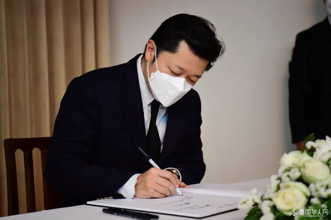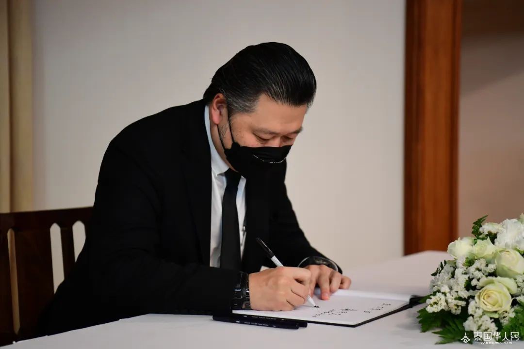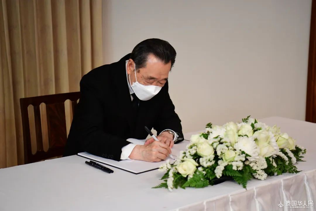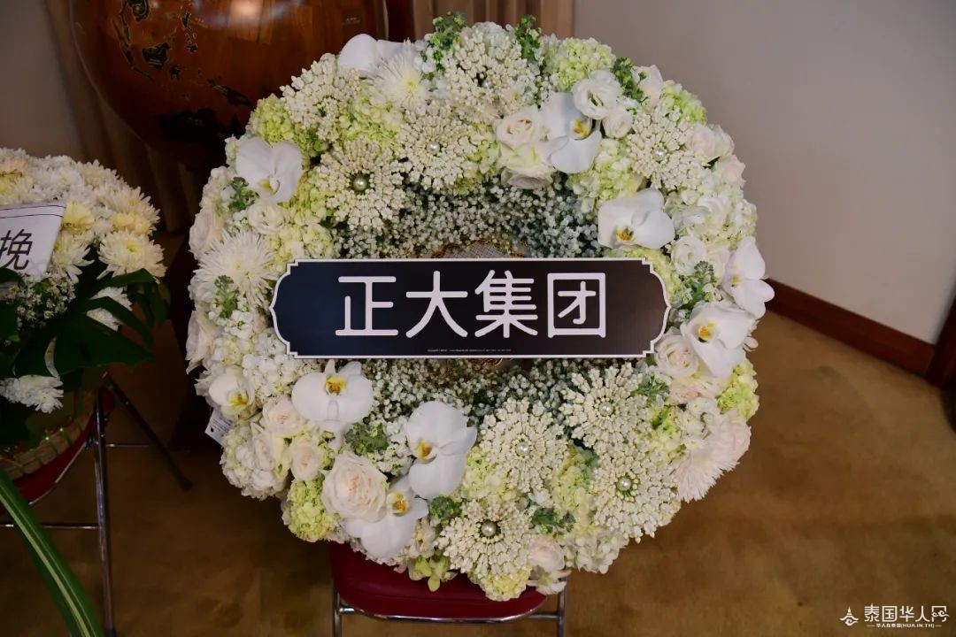 中国驻泰国大使馆在使馆设灵堂和吊唁簿,灵堂内摆放着泰国各界敬献的花圈和挽联。正大集团敬献花圈。