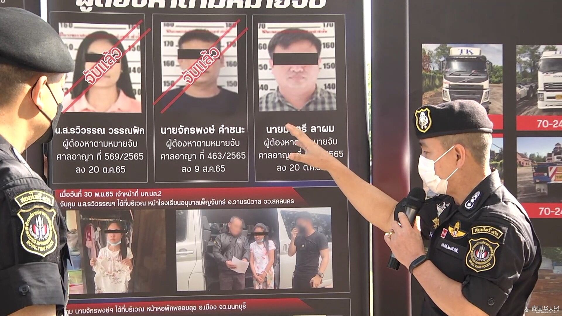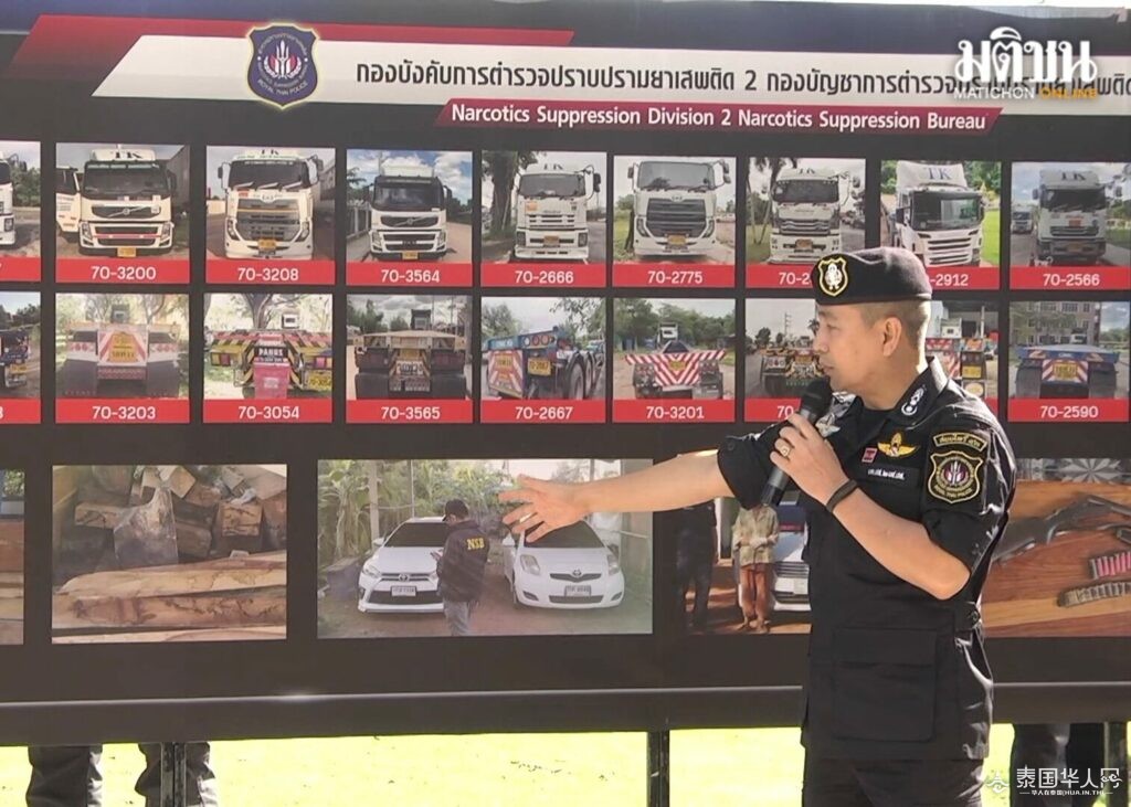 本次行动由泰国国家警察总署、禁毒局、麻醉品管制局等多个部门联合行动。该群毒贩从东北部运送毒品至南部时被抓获,并被警方缴获6辆货车、2辆轿车和2辆皮卡车、地契、存折、枪支和子弹等。