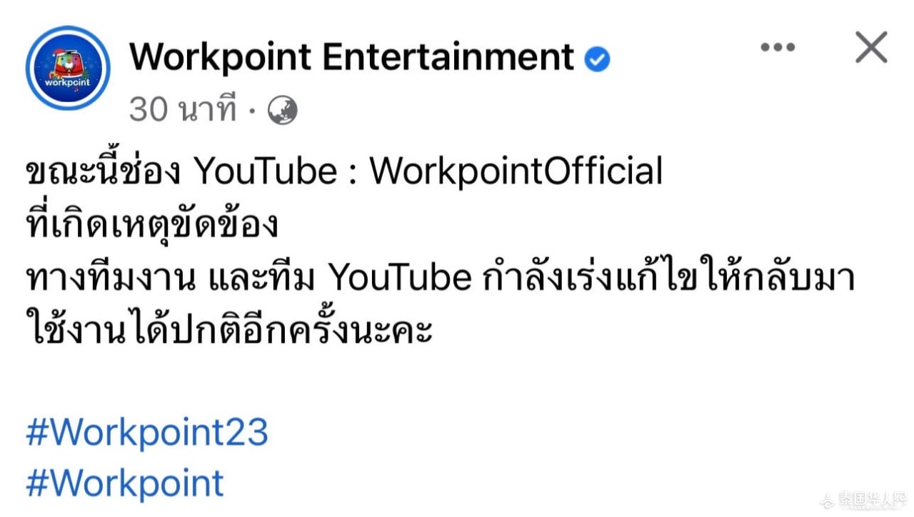 此事发生后,Workpoint Entertainment发帖表示,“目前,团队和YouTube团队正在加紧修复发生故障的YouTube频道:Workpoint Official”。