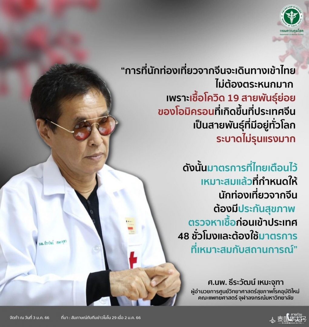 朱拉隆功大学医学院新探健康发展研究中心主任缇拉瓦教授表示,“大家不必对即将来泰旅游的中国游客感到恐慌,因为在中国发现的奥密克戎的病毒变异亚种是一种存在于世界各地的病株,且现在的疫情也不是很严重,因此泰国针对中国游客的入境防控措施是合理有效的,即中国游客须持有健康险和入境前48小时的核酸检测报告,我们也必须采取符合当下形势的合理管控措施。”
