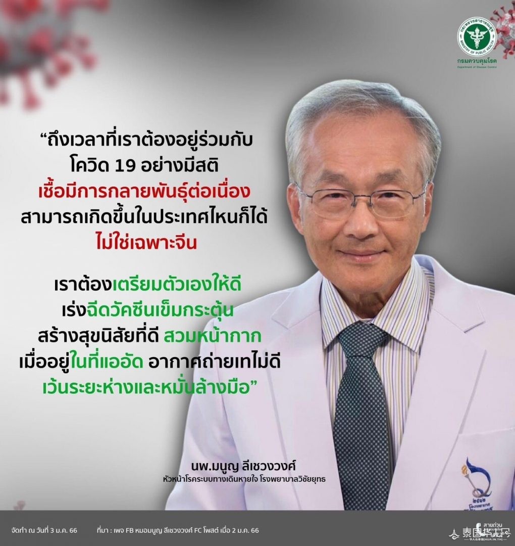 Vichaiyut医院呼吸疾病科专家玛努博士表示,“我们必须意识到现在是时候与新冠共存,且该病毒一直在不断变异,这种情况会发生在任一国家,而不仅仅是中国。我们必须要做好充足的准备,且需尽快接种加强针疫苗。除此之外,还要养成良好的卫生习惯,在人多或者不通风的地方,必须要戴好口罩,且要保持一定距离并勤洗手。”