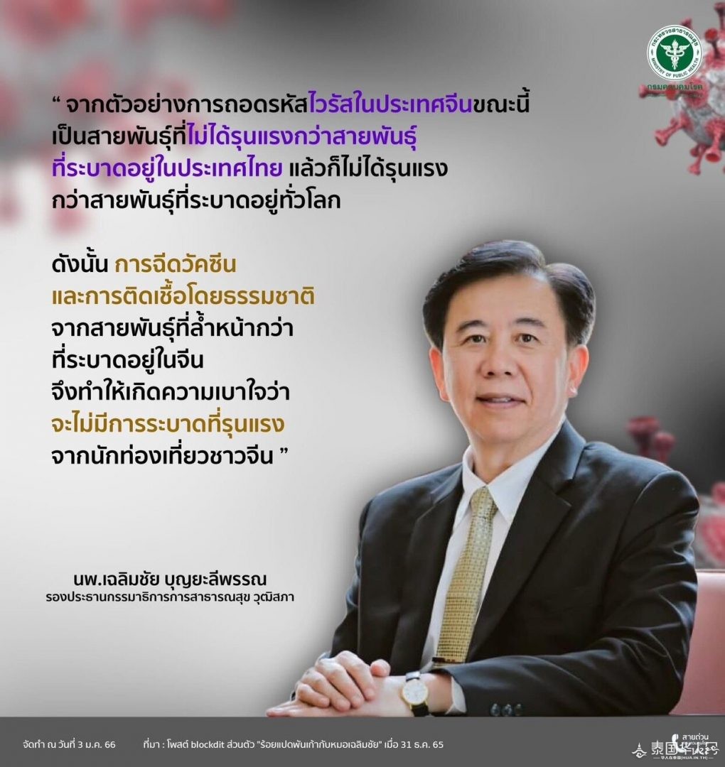 参议院公共卫生委员会副主席查棱差表示,“根据现在在中国传播的新冠毒株病毒体解密来看,这种毒株的猛烈性并没有在泰国本土爆发的毒株强,且也没有在世界范围内流行的毒株强,接种疫苗或自然感染就能预防,因此这也能够让我们稍微放宽心,即使中国游客来泰旅游也不会在泰国造成大规模的严重感染爆发。”