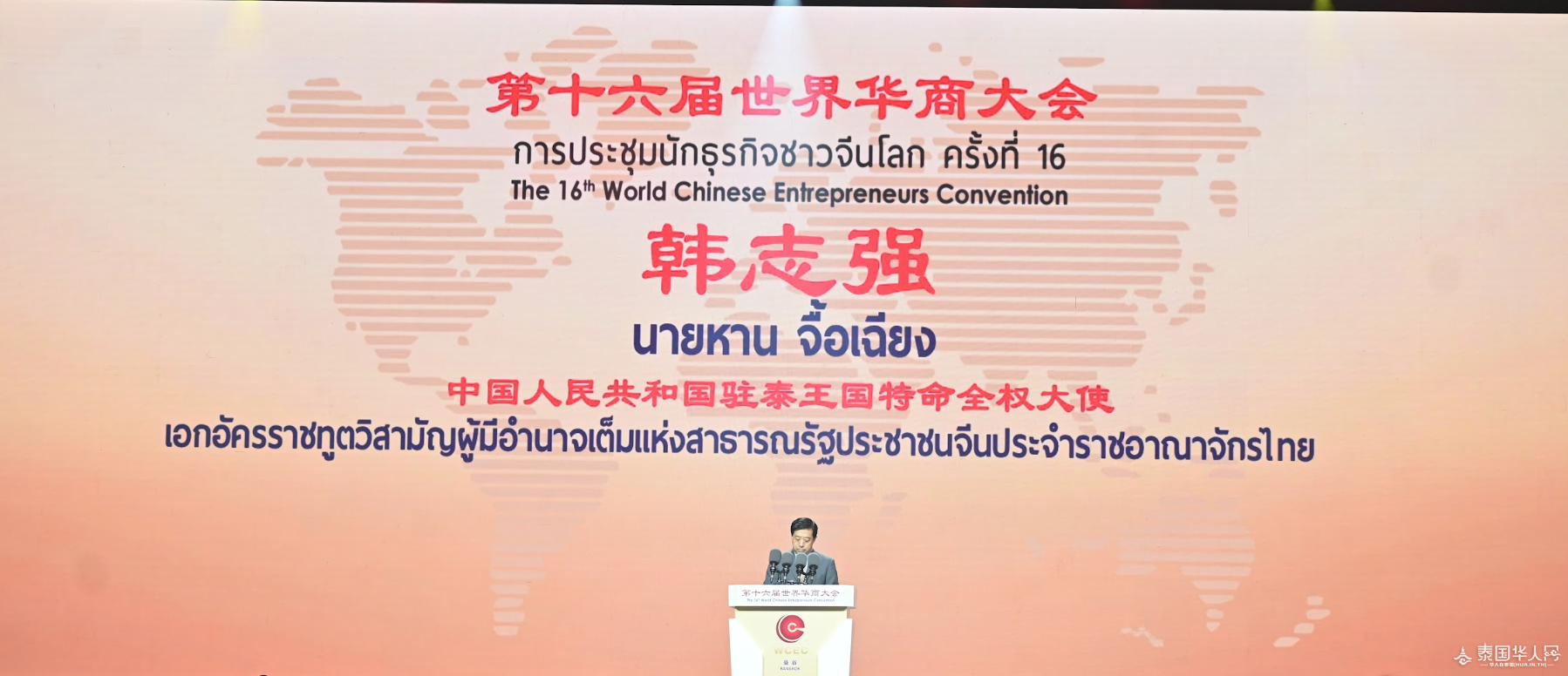 中华人民共和国驻泰王国特命全权大使韩志强阁下也在会上致辞。他在闭幕仪式上表达了对本届世界华商大会的成功举办表示热烈祝贺以及感谢各位来自全球各地的华商们的参与,期待着全球华商在泰国深化拓展互利合作,助力泰国繁荣发展。