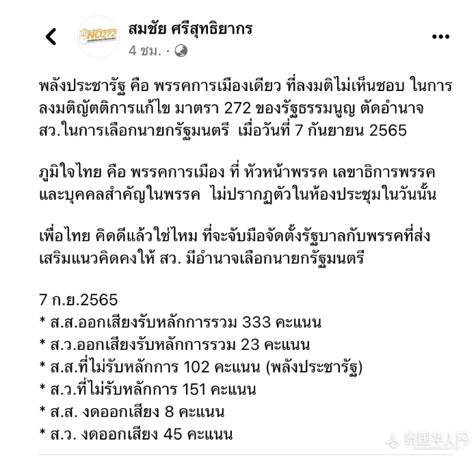 泰国华人网讯 7月31日,泰国前选举委员会成员颂猜在个人社交媒体上发帖表示,在2022年9月7日国会会议投票修改《宪法》第272条,以削减参议员选举总理的权力的过程中,政府民力党是唯一一个未支持该议案的政党。在当天的会议上,泰自豪党的党魁、秘书长以及党内其他重要领导人均未出席,因此,颂猜建议为泰党应该认真考虑是否与主张参议员拥有选举总理权力的政党联合组阁。 颂猜还在帖子中公布了2022年9月7日投票修改《宪法》第272条的具体投票结果如下: 众议员支持:共333票; 众议员反对:共102票(其中包括政府民力党的反对票); 众议员弃权:8票; 参议员支持:共23票; 参议员反对:共151票; 参议员弃权:45票;