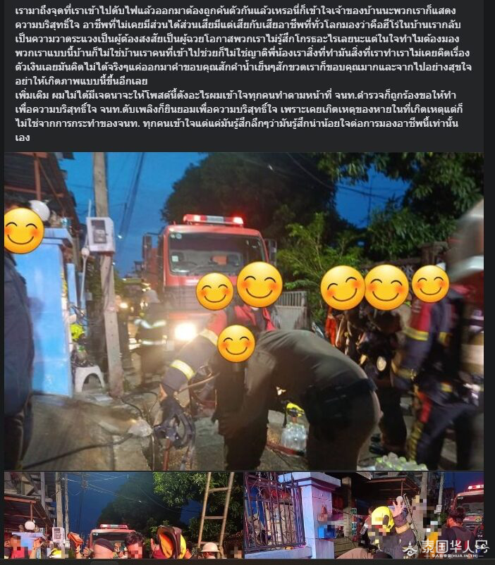 泰国华人网讯 据泰国媒体报道,近日,泰国一名消防员在其社交平台发布帖子,称其执行完救火任务后,房主担心房间内物品丢失,叫来警察对其进行搜身检查。