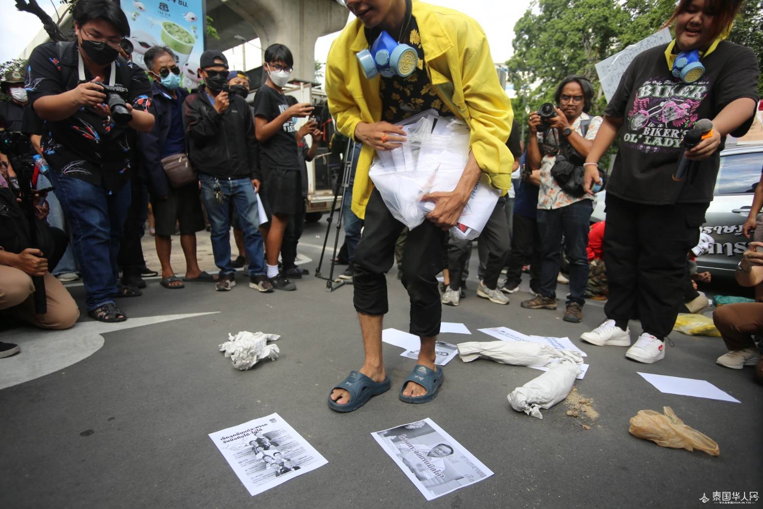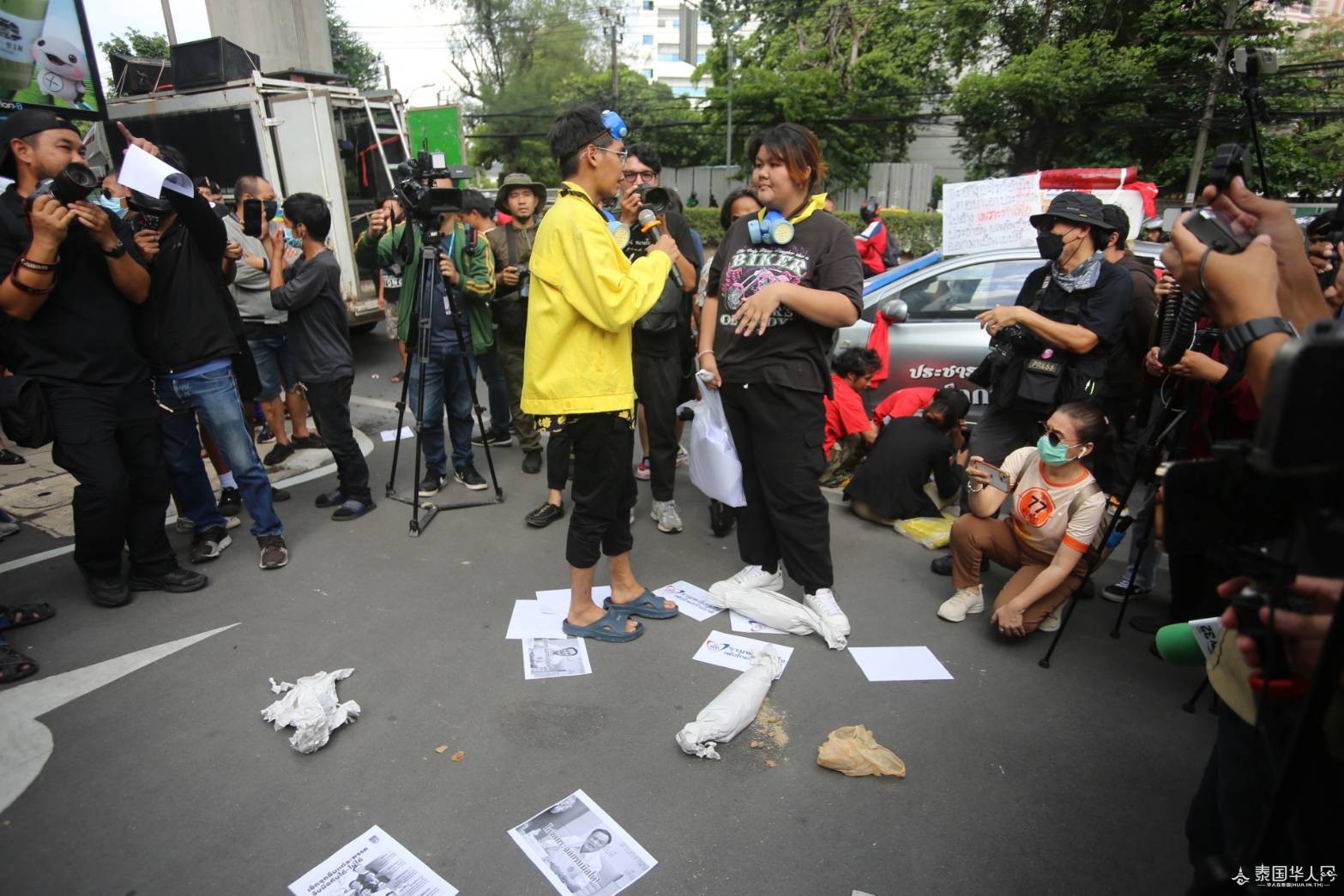 据悉,集会活动于下午2点35分开始,集会组织头目索蓬身穿黄红相间上衣,骑着摩托车带领抗议民众前往泰自豪党总部大楼。泰自豪党大楼前,抗议民众们拿出提前准备好的喷漆罐到处喷涂,将写满新冠疫情期间死亡民众信息的传单及点燃了的纸火炬扔进泰自豪党大楼,在其门牌标志上贴上粘鼠板以表达驱逐公共卫生部长建泰自豪党党魁阿努霆(阿努霆的小名直译成中文为“老鼠”),以示抗议与不满。