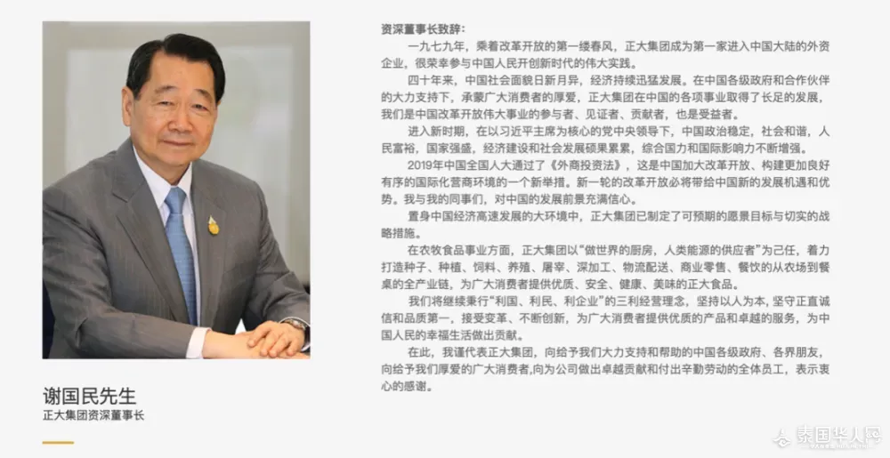 中国改革开放之初,谢国民率先来华投资,带领正大集团取得深圳市“0001号”中外合资企业营业执照。之后,正大集团相继在珠海、汕头领取了“001号”外商营业执照,成为改革开放后第一个在华投资的外商集团。 据媒体报道,当时,中国改革开放帷幕刚刚拉开,很多外资企业对于投资中国的决定还犹豫不决,因而华商谢国民坚定投资中国的积极姿态令世界经济人士震动,同时也获得了中国政府的赞扬。 邓小平还曾接见过谢国民。 谢国民接受新华社采访时回忆,邓小平1990年接见他时说,正大集团到中国投资,而且投资额很大,主要集中在农牧业,难能可贵,希望能成为外商投资的典范。 1989年,正大冠名央视《正大综艺》,成为国内家喻户晓的品牌。 截至目前,正大集团在中国设立企业600多家,下属企业遍布所有省份,员工10万人,2022年总营业额近2000亿元人民币,是中国外商投资规模最大、投资领域最多的跨国企业集团之一。 政知君注意到,谢国民还曾受邀登上天安门城楼观礼大阅兵。 2015年9月3日,来自120余个国家和地区的1779名海外侨胞应邀来到北京,参加抗战胜利70周年纪念活动。 其中,有5位德高望重、声誉卓著的侨胞代表应邀登上天安门城楼观礼,这5人中,就包括谢国民。 常态化沟通交流机制 这并不是李强和谢国民的首次见面。 2018年2月,时任上海市委书记的李强曾会见谢国民一行。当时,李强提到,“谢国民先生作为上海市荣誉市民和上海市市长国际企业家咨询会议成员,多年来致力于推动中泰两国人民友好交往,积极参与上海发展”。 这次会见,李强提到了“常态化听取外资企业诉求和建议”。 李强表示,在中国改革开放45年绘就的恢宏画卷中,广大华侨华人、海外华商书写了浓墨重彩的一笔,作出了重要贡献。 他说,当前中国正集中精力推动高质量发展,全面推进中国式现代化建设,持续打造市场化、法治化、国际化一流营商环境,常态化听取外资企业诉求和建议,积极帮助解决企业面临的困难与问题。 今年7月6日,李强在主持召开经济形势专家座谈会时曾提到: 要通过增强工作的互动性来增强决策的科学性,建立健全政府与民营企业、外资企业等各类企业的常态化沟通交流机制,深入了解新情况新问题,及时改进政策举措,进一步提振信心、稳定预期。 近期,商务部升级建立了外资企业圆桌会议制度。 7月5日,商务部部长王文涛主持召开外资企业圆桌会,听取医药行业外资企业在华经营情况、问题诉求及意见建议。 当时,王文涛指出,按照国务院部署,商务部依托外贸外资协调服务机制,在现有常态化交流机制基础上,升级建立外资企业圆桌会议制度。 “我们将通过这个机制性安排,定期举办会议,进一步拓展收集问题、听取建议的渠道,及时回应解决企业关切,助力外资企业在华长期、稳定发展。” (来源:新华社 央视 人民网 中国政府网 商务部网站等) 原文:Thailand Headlines |