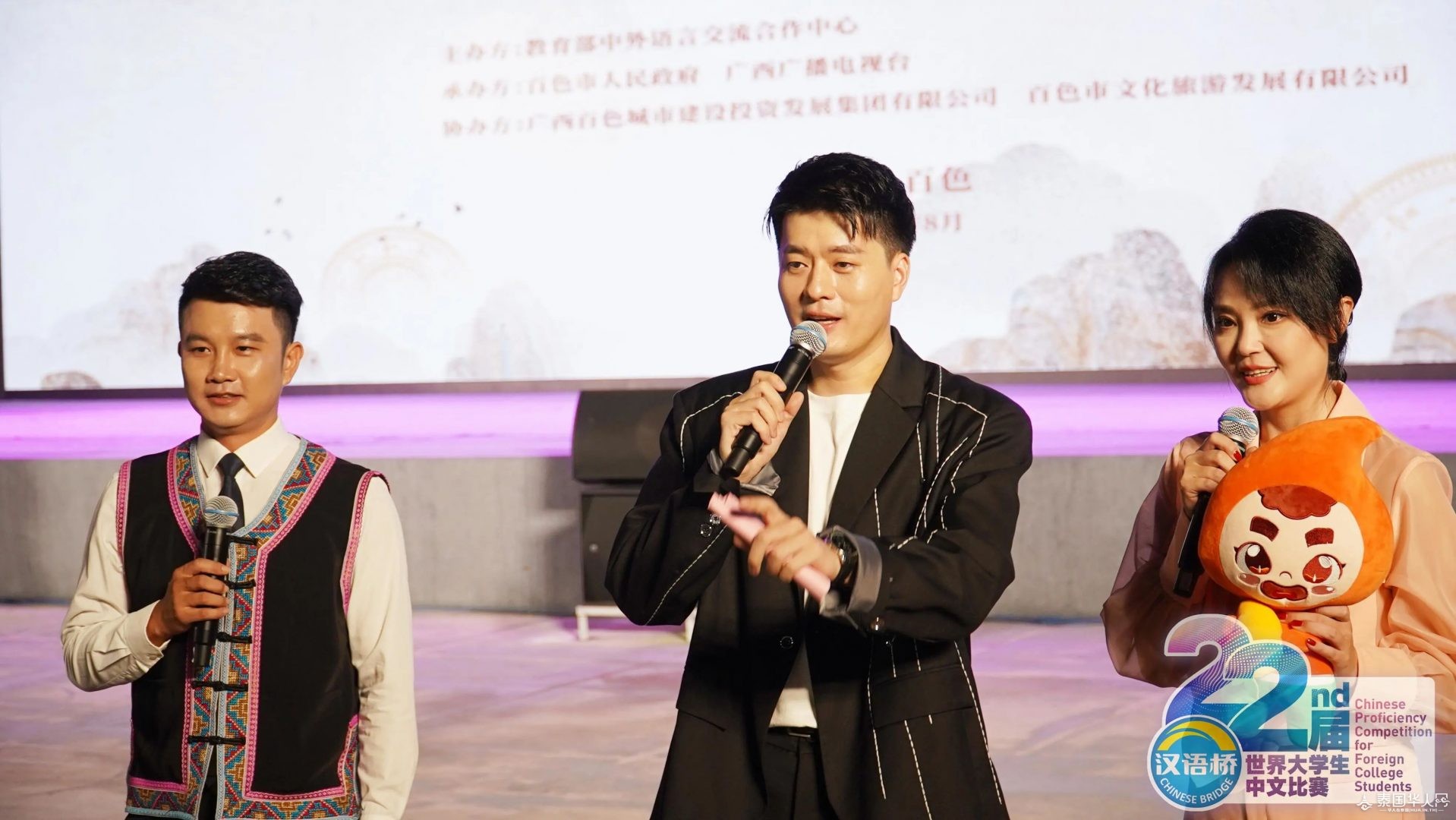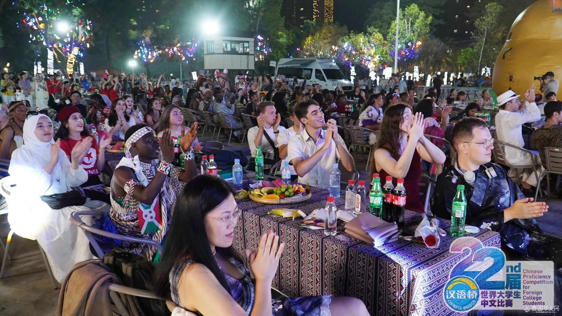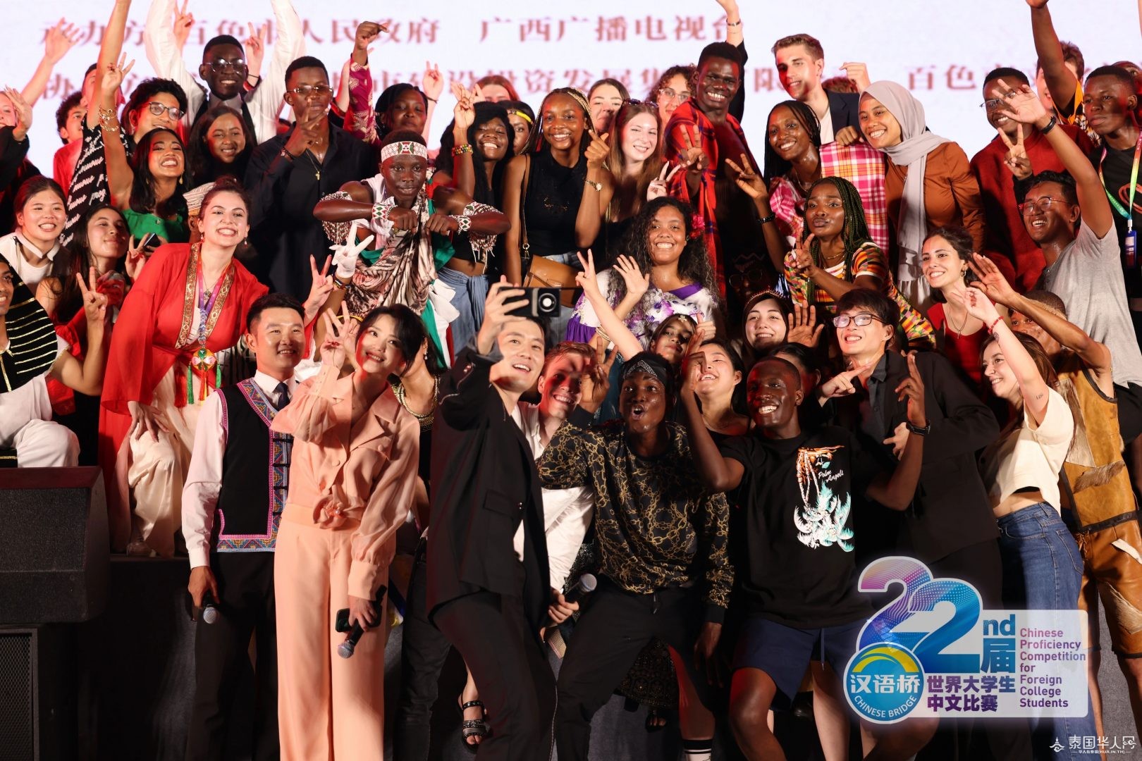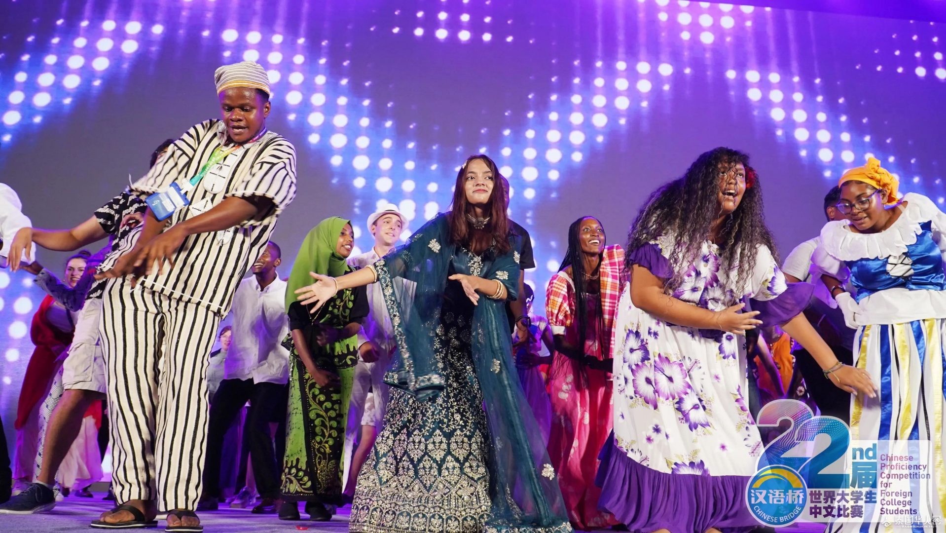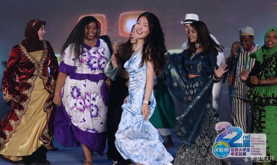 来自五大洲的选手身着本国传统服饰 踏着音乐节拍惊艳亮相向观众展示世界民族服饰的无穷魅力 8月22日晚 第22届“汉语桥” 世界大学生中文比赛选手夏令营 在百色市右江区沙滩休闲公园 刮起“最炫民族风”