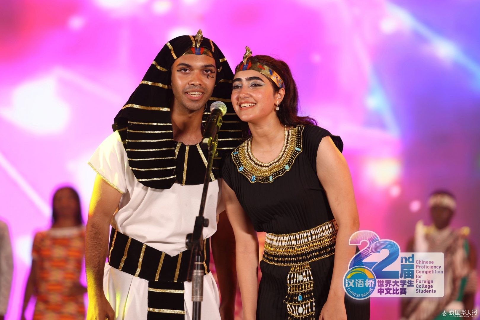 △埃及参赛选手刘艾(左)向观众展示古埃及法老服。 选手黄立璇身着古代缅甸皇帝服饰 为现场观众带来一支 来自缅甸古老城市蒲甘的民族舞