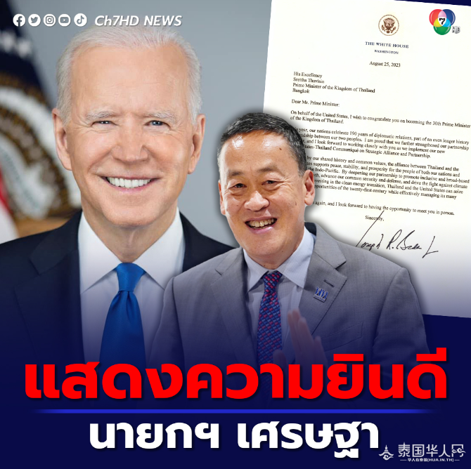 泰国华人网讯 美国总统拜登于8月25日向赛塔致函表示祝贺,并表达了进一步加强双边关系的愿望。信函内容如下: “我代表美利坚合众国,谨向您就任泰王国第30任总理表示最诚挚的祝贺。今年恰逢美泰两国建交190周年,这段悠久历史见证了我们之间深厚的友谊。在过去的一年里,我对于我们共同的伙伴关系日益增强感到十分自豪。期许着我们在未来能够进一步深化合作。我们将继续共同签署新的美国-泰国联合声明,通过战略伙伴关系和联盟来推动我们的合作。” “美泰联盟将致力于支持两国人民以及整个印太地区的和平、稳定与繁荣。我们将进一步加强合作,促进广泛、包容的经济增长,共同发展国家安全和国防,并通过投资清洁能源来应对气候变化。我坚信,泰国和美国将共同把握住21世纪的巨大机遇,同时有效解决众多的挑战。”