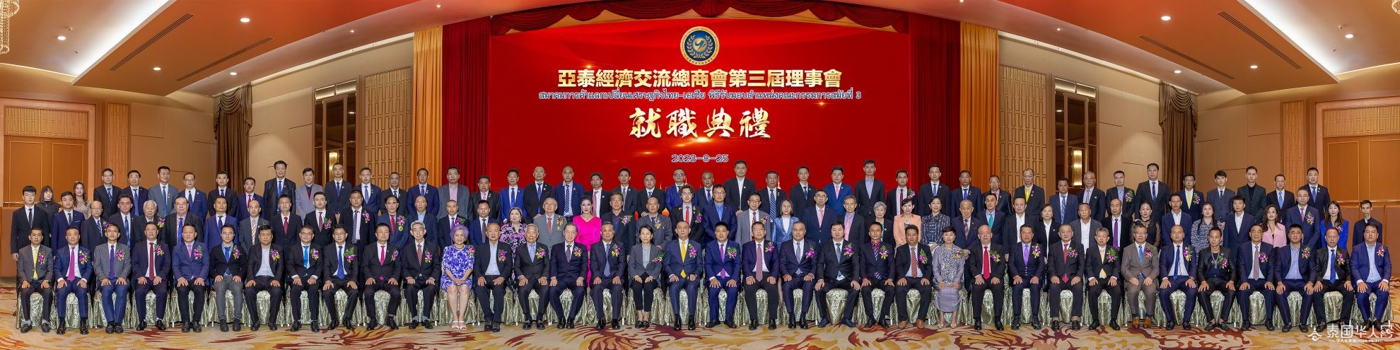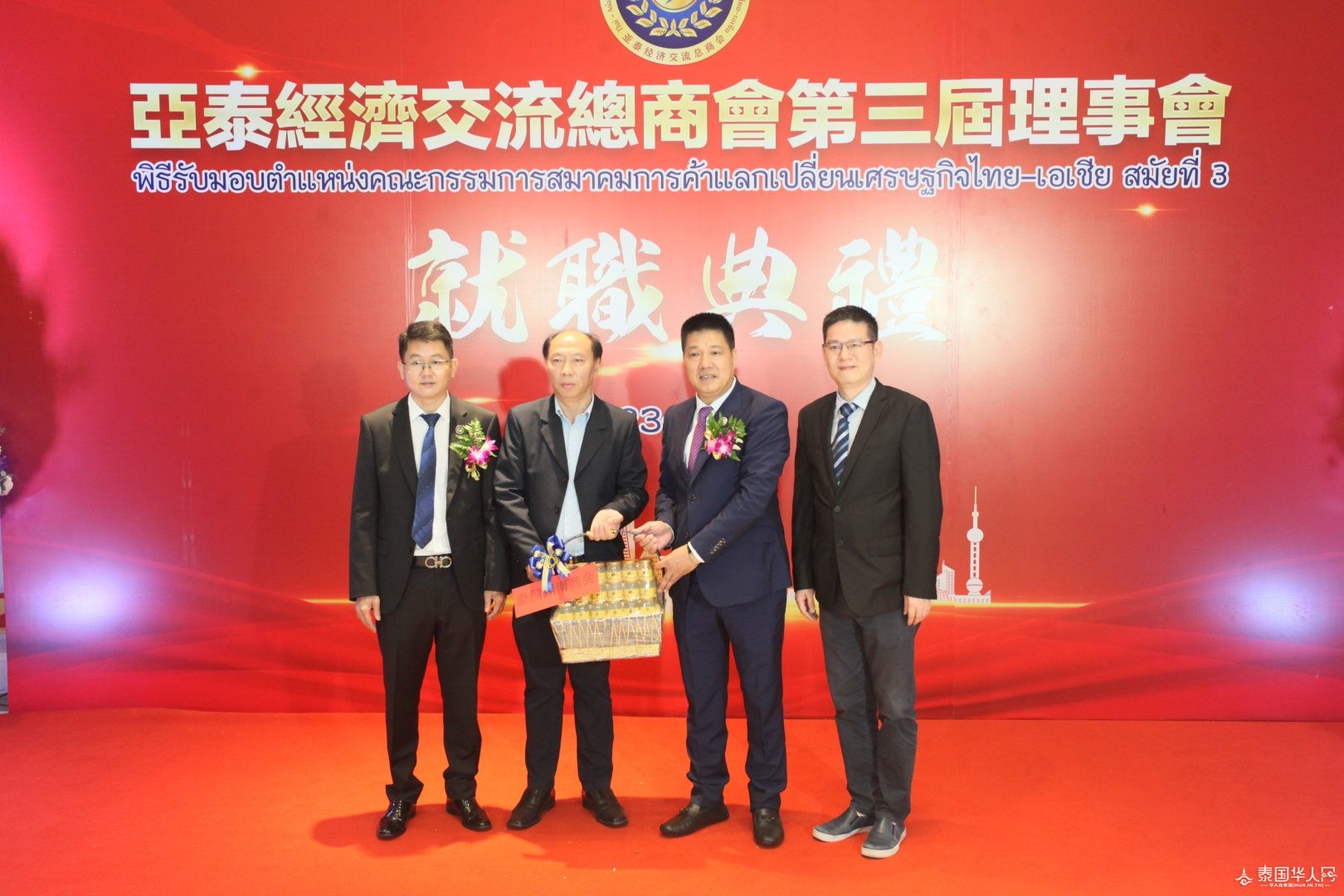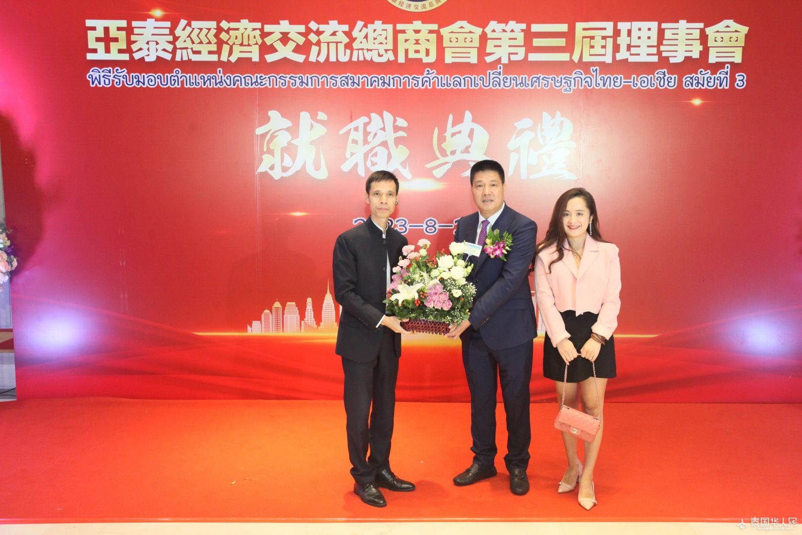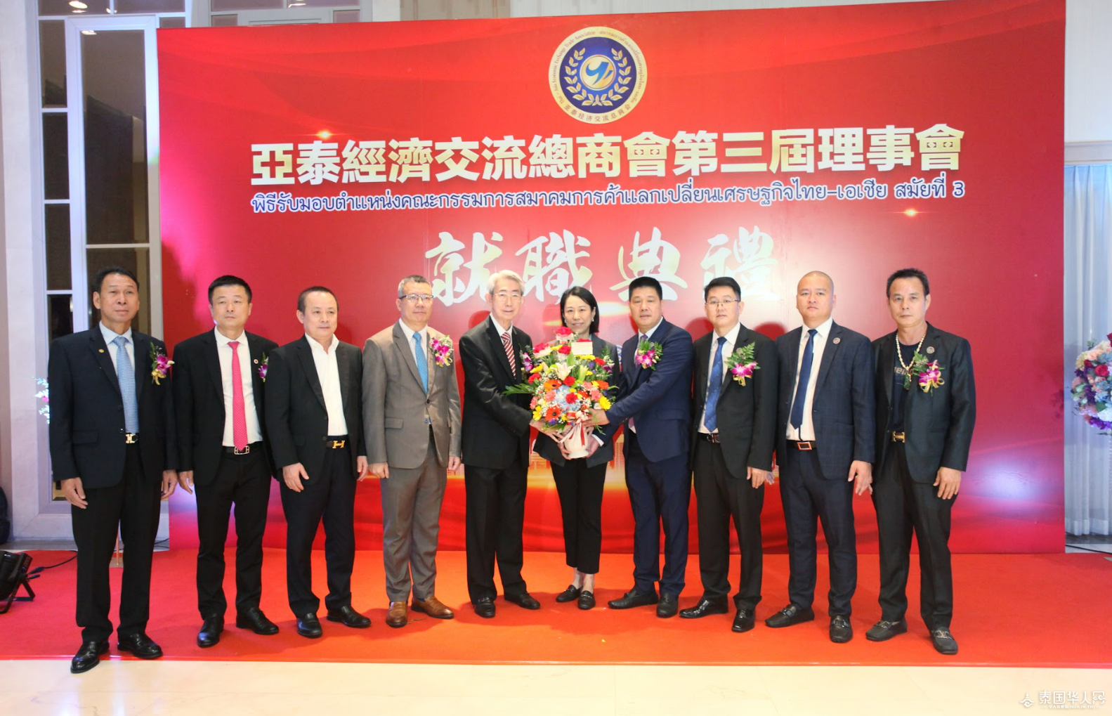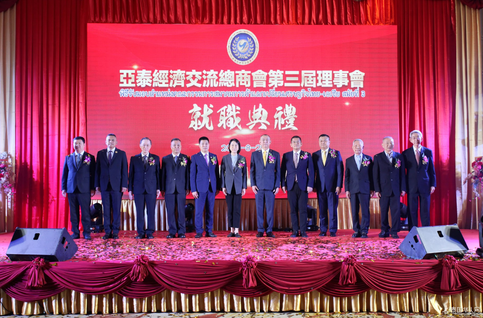 泰国华人网讯 亚泰经济交流总商会第三届理事会就职典礼于2023年8月25日(星期五)晚六时在泰国中华总商会光华堂隆重举行,泰国农业与合作社部长查霖猜·诗喜翁阁下(李金朵)担任大会主席主持仪式,中国驻泰大使馆经济商务处张潇潇参赞、梅州市委常委、梅州市海外联谊会会长崔毅、梅州市侨联主席汤志平、泰国国防部次长参谋主任塔纳帕上将、泰国警察总署长助理功猜·概恳警中将、曼谷第九区警察局长蓬阿喃警少将、泰国中华总商会代主席何克家、泰国潮州会馆代主席黄烈凯、泰国中国和平统一促进总会会长王志民博士以及泰华各侨团领导、各界嘉宾等逾200人出席致贺,场面热烈,气氛温馨!