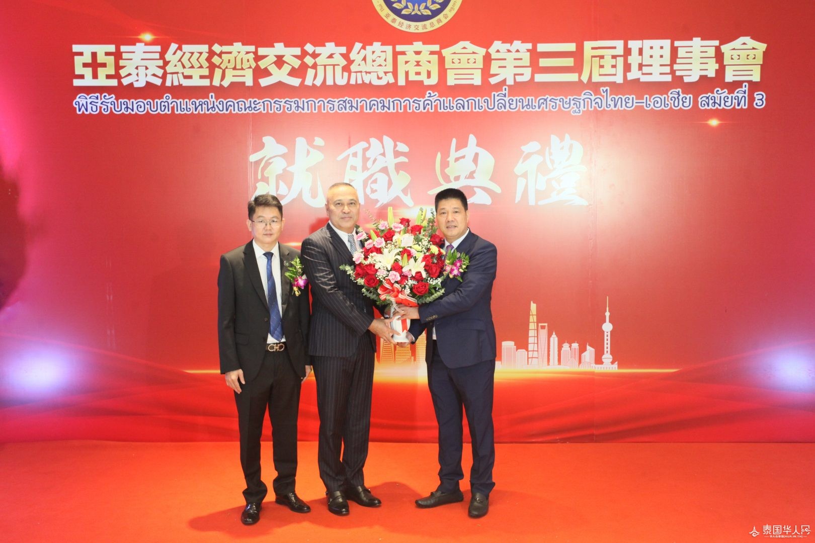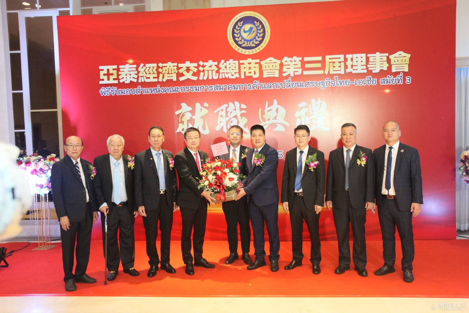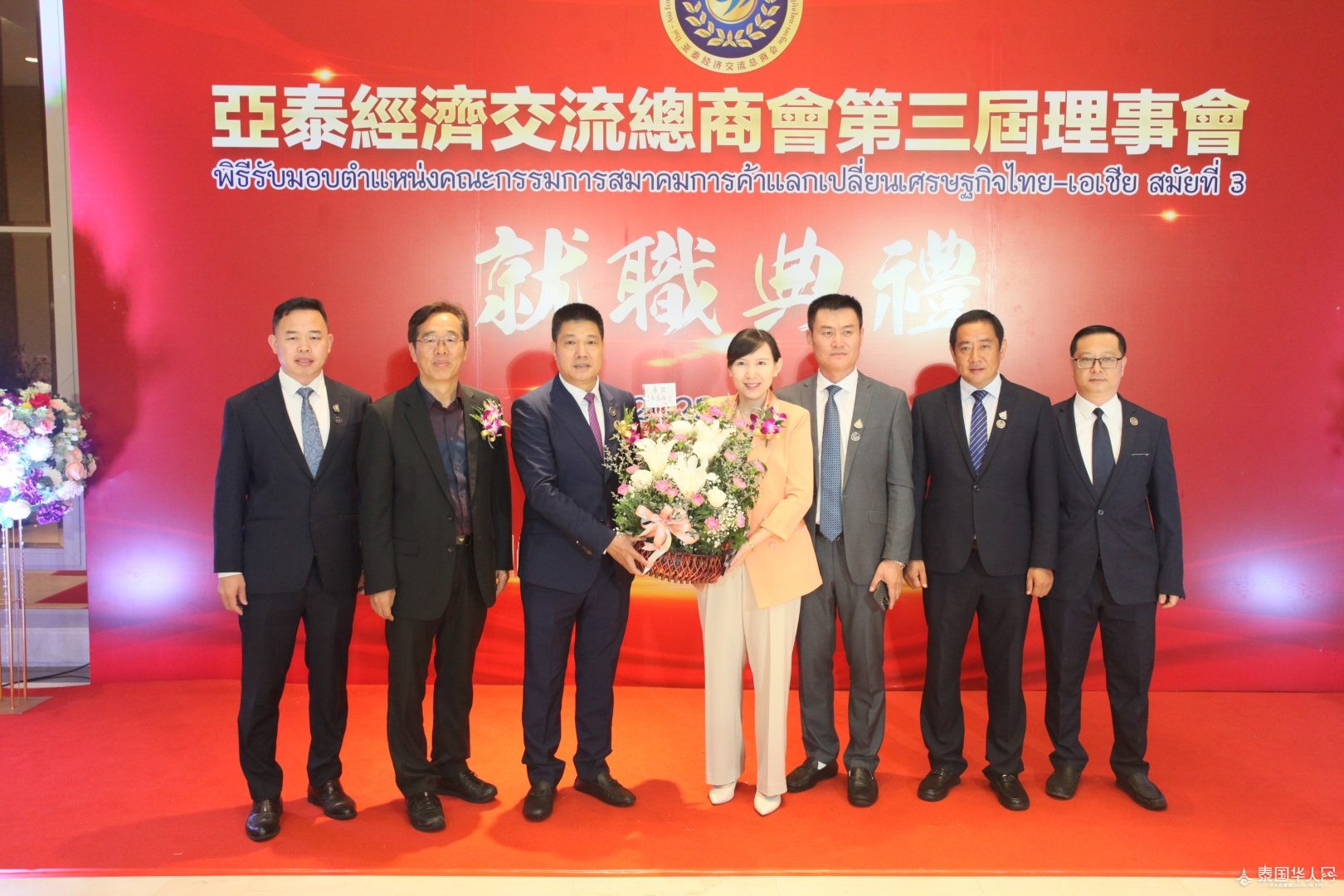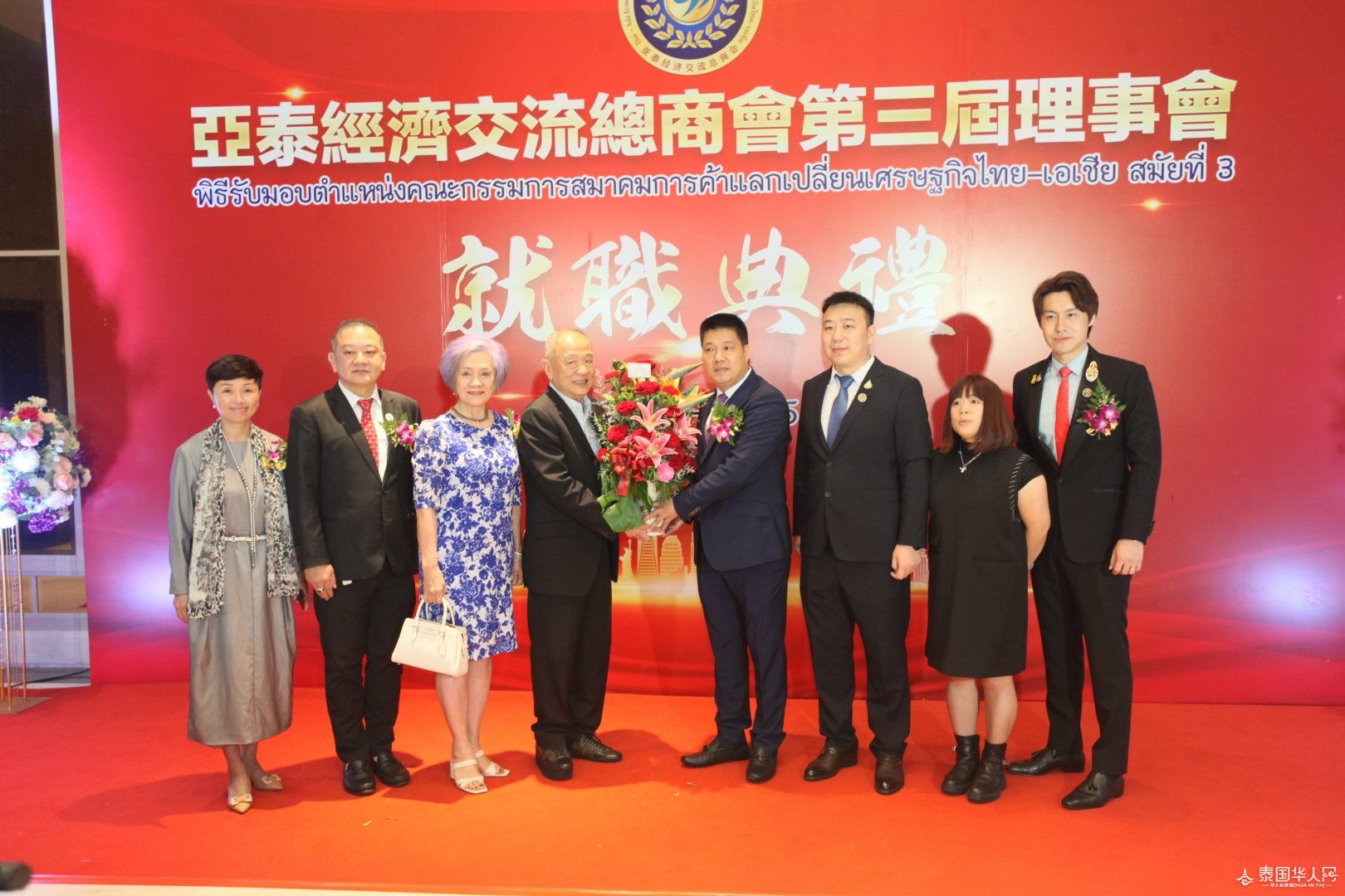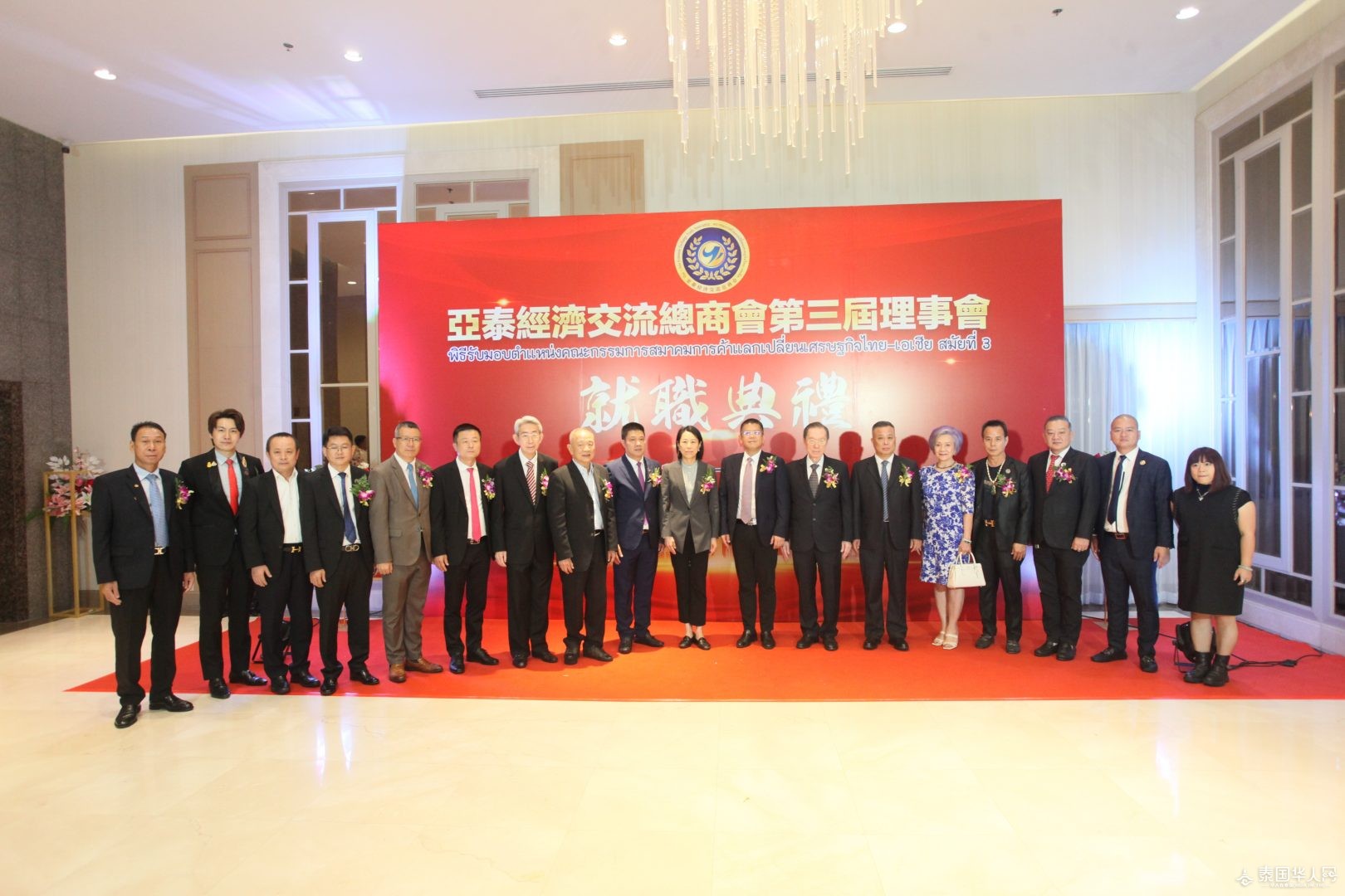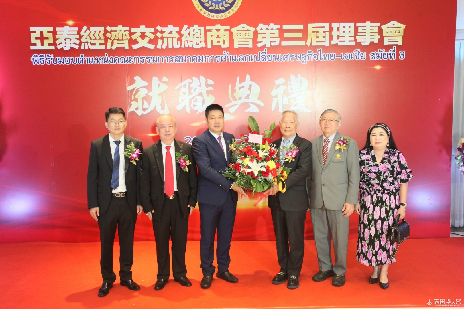 泰国华人网讯 亚泰经济交流总商会第三届理事会就职典礼于2023年8月25日(星期五)晚六时在泰国中华总商会光华堂隆重举行,泰国农业与合作社部长查霖猜·诗喜翁阁下(李金朵)担任大会主席主持仪式,中国驻泰大使馆经济商务处张潇潇参赞、梅州市委常委、梅州市海外联谊会会长崔毅、梅州市侨联主席汤志平、泰国国防部次长参谋主任塔纳帕上将、泰国警察总署长助理功猜·概恳警中将、曼谷第九区警察局长蓬阿喃警少将、泰国中华总商会代主席何克家、泰国潮州会馆代主席黄烈凯、泰国中国和平统一促进总会会长王志民博士以及泰华各侨团领导、各界嘉宾等逾200人出席致贺,场面热烈,气氛温馨!
