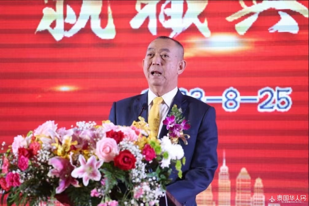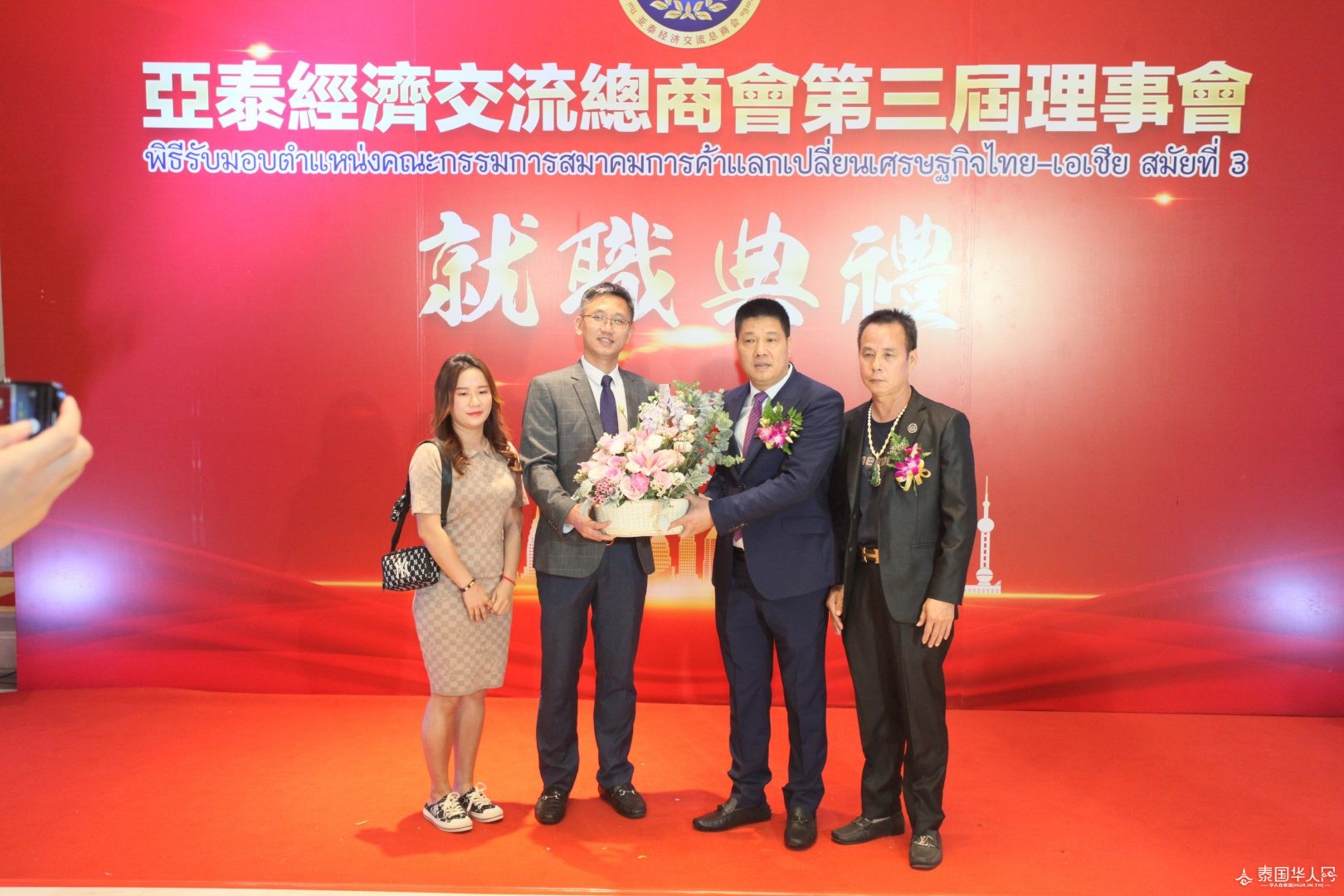 8月25日晚六时,泰国中华总商会光华堂鲜花锦簇,喜庆热闹,泰中长官及侨领嘉宾陆续抵达会场,亚泰经济交流总商会第三届会长李胜交、执行会长陈锦潮、名誉会长吴文辉、黄宁申、会务顾问郑友民、顾问徐位林、常务副会长邱俊杰、蔡贤林、王益承及诸位副会长、理事热情迎接来宾。晚七时,亚泰经济交流总商会第三届理事会就职典礼隆重举行,全体肃立,奏泰中国歌。恭请大会主席、泰国农业合作社部长查霖猜·诗翁阁下(李金朵)登台致辞向李胜交先生蝉联亚泰经济交流总商会第三届会长表示祝贺,盛赞亚泰经济交流总商会基于血缘关系和泰中友好关系,为促进泰中经贸往来做出巨大的努力,备受各界赞赏。 查霖猜部长表示:“亚泰经济交流总商会成立至今届满四年,现在进入第五年,泰中友好关系源远流长,泰中亲如一家,很多的泰国人有中国血统,我本人也是华裔。亚泰经济交流总商会、还有在泰国的很多华人社团,都在为努力促进泰中经贸奉献力量。泰中的友好与血缘有很重要的关系,中国对泰国非常重视和支持,我担任农业合作社部长后首次出访就是到中国,受到中国政府温暖的接待,并对促进泰国农产品销往中国的要求给予合作,给予很多特权,最明显的就是向中国出口榴莲,在三年多的时间里从每年一百多亿铢提升到每年一千多亿铢的出口量。在泰的华人社团对促进泰产品出口中国起着积极的推动作用。我希望泰中两国永远友好合作。今天,亚泰经济交流总商会第三届理事会就职,我感谢商会让我担任永远荣誉会长,在我卸任政治职位之后,我也要经商,我将和大家一道来促进泰国与中国的经贸合作关系”。
