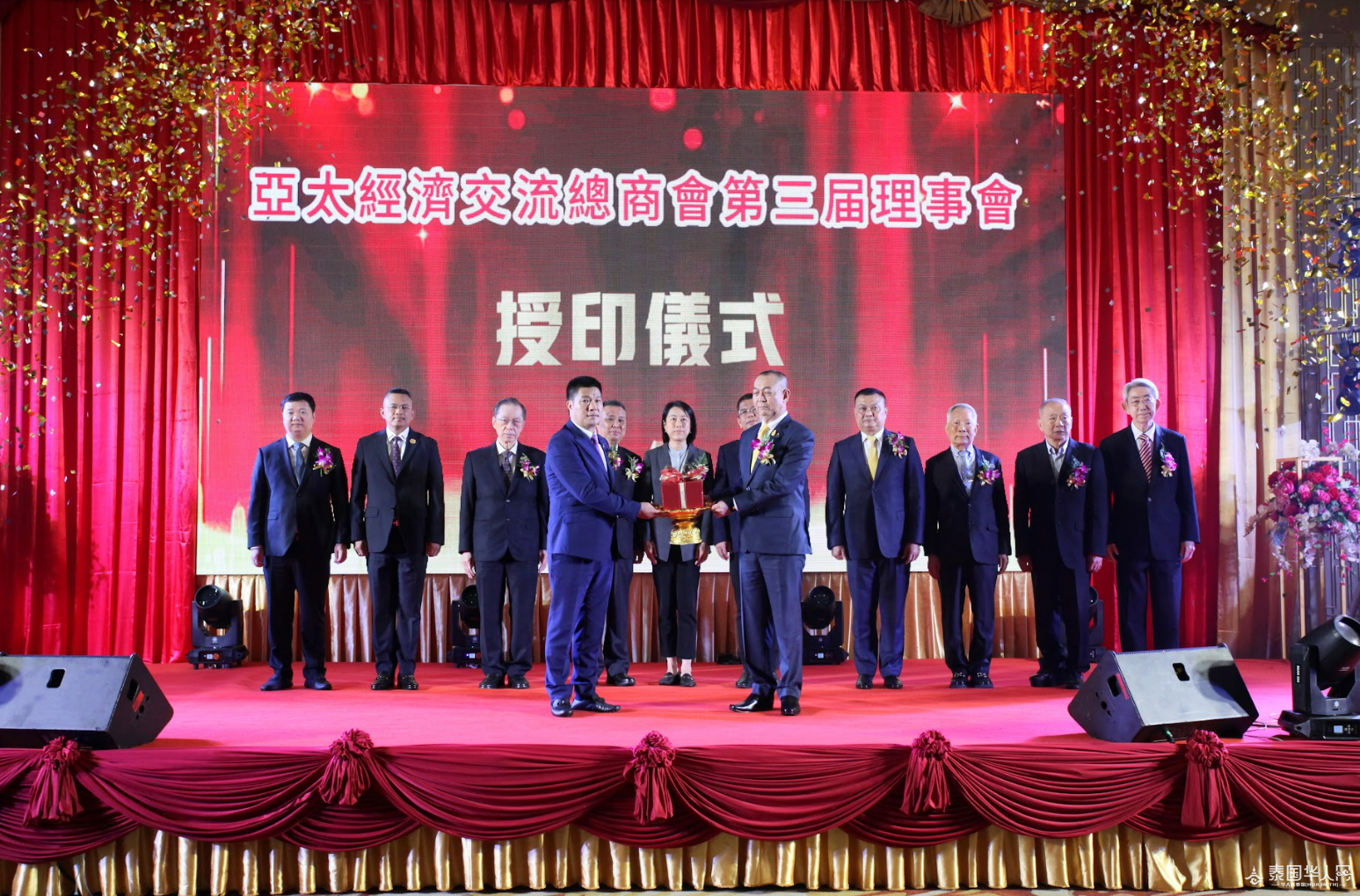 大会主席、泰国农业合作社部长查霖猜·诗翁阁下致辞完毕,举行颁授印信仪式,查霖猜·诗翁阁下向第三届会长李胜交颁授印信,恭请中国驻泰大使馆经济商务处张潇潇参赞,梅州市委常委、梅州市海外联谊会会长崔毅,梅州市侨联主席汤志平,国防部次长参谋主任塔纳帕上将、泰国警察总署长助理功猜·概恳警中将、曼谷第九区警察局长蓬阿喃警少将、泰国中华总商会代主席何克家,泰国潮州会馆代主席黄烈凯、泰国中国和平统一促进总会会长王志民博士、亚泰经济交流总商会名誉会长吴文辉、亚泰经济交流总商会名誉顾问郑岳龙登台监证仪式、全场嘉宾热烈鼓掌向李胜交会长暨第三届理事会表达祝贺。中国驻泰大使馆经济商务处张潇潇参赞,梅州市委常委、梅州市海外联谊会会长崔毅,泰国中华总商会代主席何克家、泰国潮州会馆代主席黄烈凯分别登台致祝贺辞,诸位长官及侨团首长致辞中高度讚扬亚泰经济交流总商会在年轻有为,德才兼备的李胜交会长的带领下,秉持着“携手并进,共谋发展”的创会宗旨,积极推动“一带一路”建设,把握RCEP新机遇,团结旅泰华侨华人,搭建泰中友好桥樑,为推动泰中两国及亚洲各国间的友好往来、文化交流及商贸投资等各领域合作做出了杰出贡献,特别是为支持中泰两国抗疫给予大力支持,功不可没。相信在第三届会长李胜交的带领下,亚泰经济交流总商会定能蒸蒸日上,在新时期为泰中友好合作与经济繁荣做出更多更大的贡献!