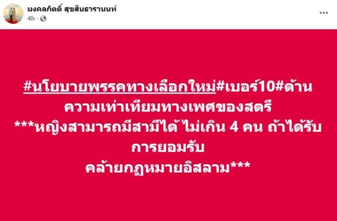 泰国另类党总理候选人孟果吉·素金塔拉农特在社交媒体上表示:“从性别平等角度看,如果各方达成共识,女性应被允许拥有不超过四名丈夫。”该提案发布后,引发了公众和网友对其是否反映进步思维、政治讽刺或刻意引发讨论的热烈讨论。