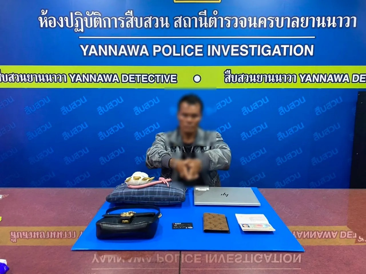 | 泰国华人网讯 2026年1月17日晚,曼谷Yannawa警察局迅速破获一起针对中国游客的盗窃案,仅用不到24小时便抓获嫌犯,追回所有失物。事发地点位于邦巴沙都拍区Khlong Mahanak Lan Luang路一家便利店门前。45岁男子皮亚涉嫌盗窃中国游客的贵重物品,被警方当场逮捕。警方扣押的赃物包括蓝色电脑包(内含银灰色HP笔记本,价值约25,000泰铢)、黑色Gucci手提包(价值约100,000泰铢)、中国招商银行ATM卡、棕色LV钱包(价值约30,000泰铢)、护照以及作案时所穿灰色SPORT品牌背包、长袖上衣和大象裤。