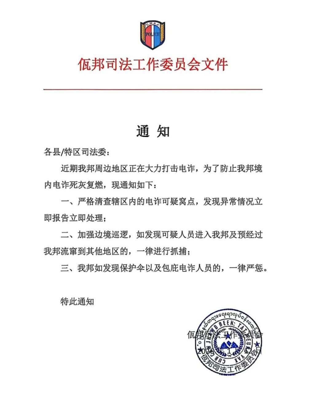 佤邦司法委表示,将继续保持高压打击态势,深化执法能力建设,完善跨境犯罪预警防范体系,并进一步推进与中方在情报交流、案件协查及联合行动等领域的深度合作,通过更紧密的执法安全网络,共同构建区域安全屏障,保障边境地区长治久安与两地民众福祉。 佤邦司法委办公室法制宣传科严正声明:任何企图在我邦境内从事违法犯罪活动的个人与组织,必将受到法律严惩,警告所有不法分子悬崖勒马,不要存有侥幸心理。 |