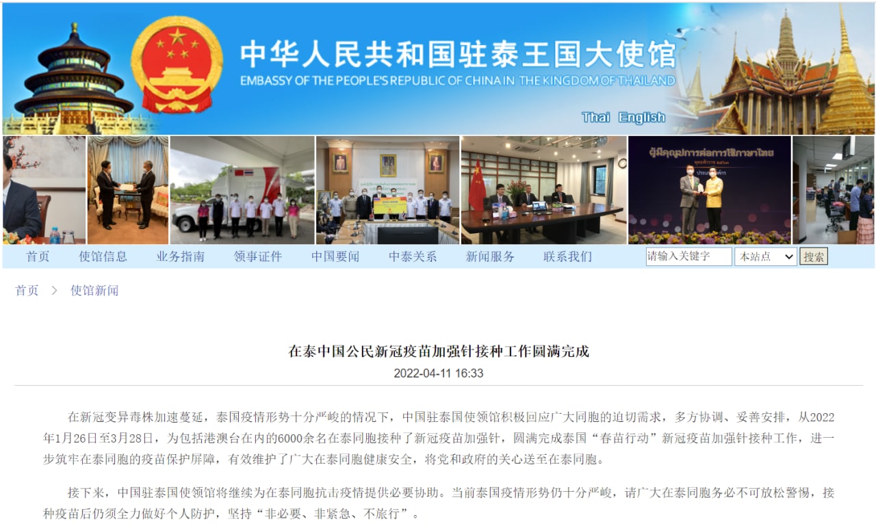 4月11日,中国驻泰大使馆发布《在泰中国公民新冠疫苗加强针接种工作圆满完成》,内容如下: 在新冠变异毒株加速蔓延,泰国疫情形势十分严峻的情况下,中国驻泰国使领馆积极回应广大同胞的迫切需求,多方协调、妥善安排,从2022年1月26日至3月28日,为包括港澳台在内的6000余名在泰同胞接种了新冠疫苗加强针,圆满完成泰国“春苗行动”新冠疫苗加强针接种工作,进一步筑牢在泰同胞的疫苗保护屏障,有效维护了广大在泰同胞健康安全,将党和政府的关心送至在泰同胞。 接下来,中国驻泰国使领馆将继续为在泰同胞抗击疫情提供必要协助。当前泰国疫情形势仍十分严峻,请广大在泰同胞务必不可放松警惕,接种疫苗后仍须全力做好个人防护,坚持“非必要、非紧急、不旅行”。 |