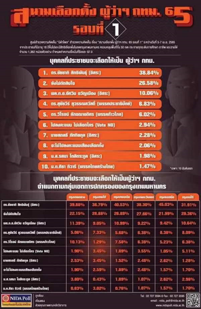 国家发展行政学院民意调查中心“ NIDA 民调”公布了2022年曼谷市长选举第1轮民调结果,该结果显示查察博士的支持占比在各区皆排名第一。 据悉,关于曼谷市长选举的民调于4月5日至7日进行,调查范围覆盖曼谷50个区,调查对象为年满 18 岁并且拥有选举权的各个阶层的曼谷人。此外,该调查是基于NIDA民意调查主样本数据库的概率抽样法进行,同时通过电话访问进行了简单的随机抽样,具有97.0%的置信度。