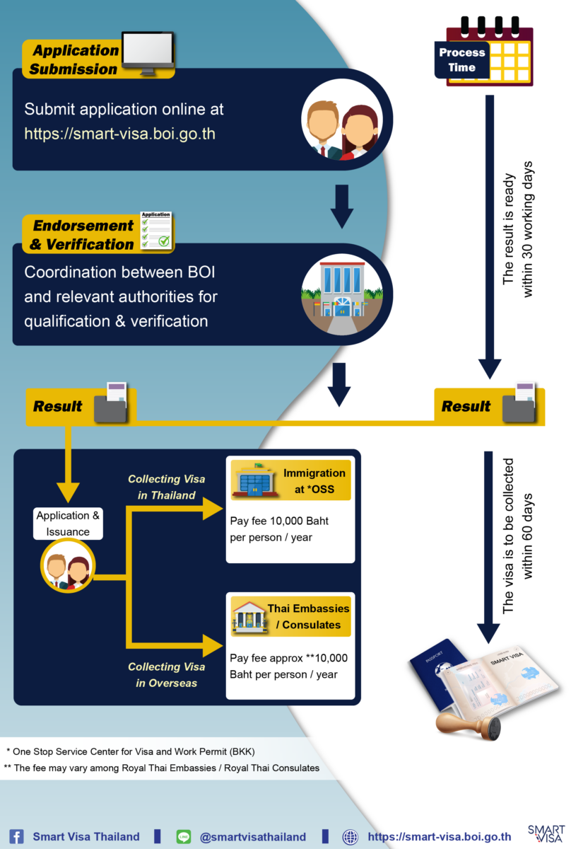 为了加快泰国 "目标产业 "的发展,投资委员会向外国投资者、管理人员、企业家和高技能专家提供为期4年的SMART签证。昨天,泰国内阁宣布修改SMART签证的要求,并扩大了目标行业的名单。 持有SMART签证者可在泰国合法工作且无需额外申请工作签证。 内阁宣布,申请SMART签证的投资者必须对在生产过程中使用技术或提供服务的企业进行不少于2000万泰铢的直接投资。 SMART签证 "的申请人必须具有符合投资委员会办公室规定的标准的资格。他们的资格将由相关机构进行核实。在获得技术和非技术方面的认可后,SMART签证单位将着手签发资格认证,申请人将携带该认证到泰国大使馆或皇家领事馆(如居住在海外)或春武里府签证和工作许可一站式中心的移民局或EEC劳动管理中心,以便申请SMART签证。 具体详情可查看SMART Visa官网:https://smart-visa.boi.go.th/smart/pages/about.html