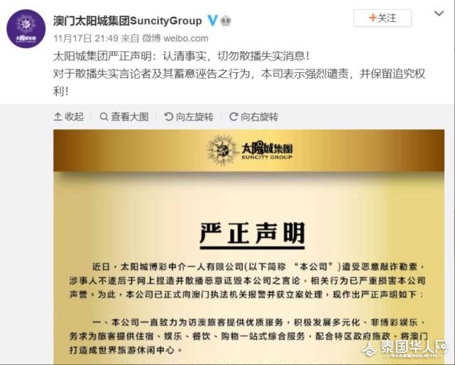 ![]() 周焯华被批捕 10天前上市公司曾发辟谣声明 就在周焯华被批捕前10天,11月17日,太阳城集团有限公司通过官方微博发布过一则声明,称太阳城博彩中介一人有限公司遭受恶意敲诈,涉事人敲诈未遂后于网上散布谣言诋毁公司,公司已报警并获立案处理。