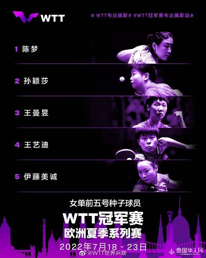 中新网北京6月24日电 据WTT世界乒联消息,首届WTT冠军赛(欧洲夏季系列赛)将于7月18日至23日在匈牙利首都布达佩斯举行。目前参赛名单已确认,奥运冠军马龙、陈梦将领衔出战,众多顶尖球员参赛。