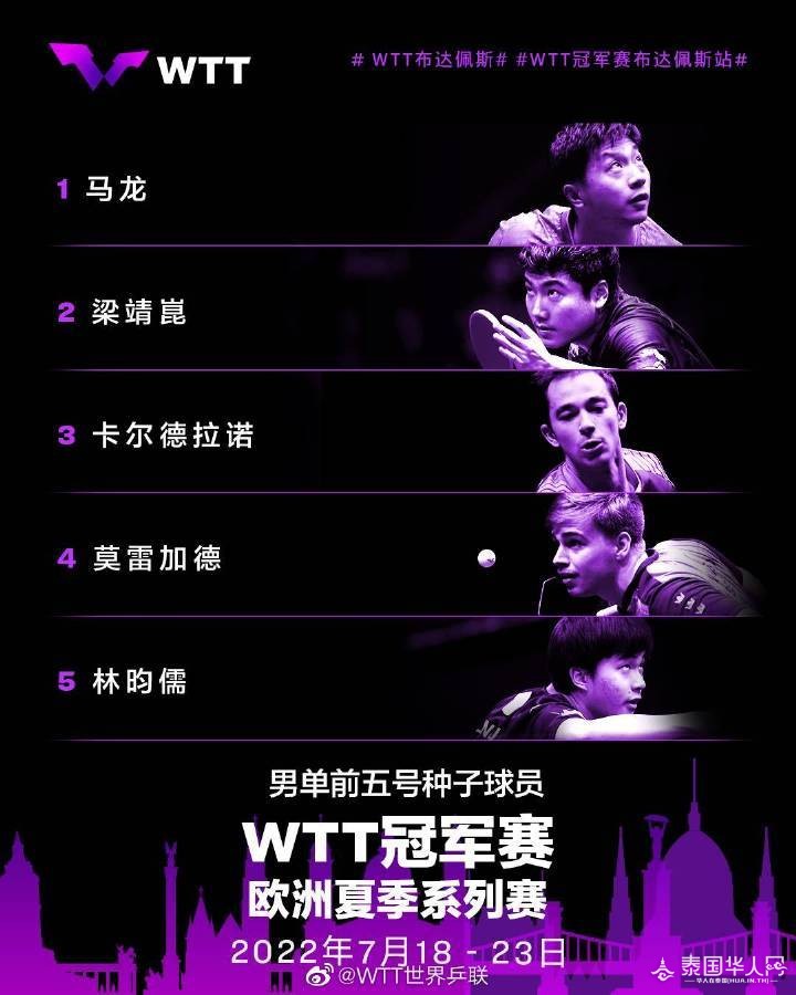 图片来源:WTT世界乒联 WTT冠军赛布达佩斯站将合并男女赛事,该赛事设置男女单打各32个参赛席位,包括世界排名前30位的球员以及两个外卡名额。 马龙、陈梦领衔国乒参赛阵容。女单方面,世界排名前4的陈梦、孙颖莎、王曼昱以及王艺迪将联袂参赛,日本名将伊藤美诚将向中国队发起挑战。男单方面,由于樊振东缺席,马龙将成为赛事头号种子,梁靖崑、王楚钦、林高远也将出战。