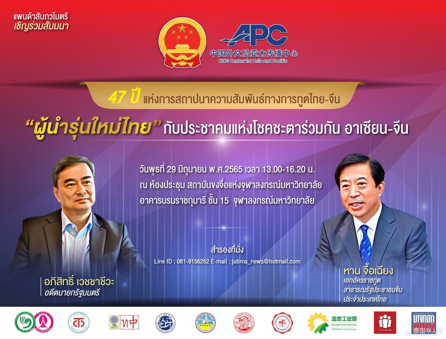 泰国华人网讯 中国驻泰大使馆与中国外文局亚太传播中心将于2022年6月29日下午13:00-16:20于朱拉隆功大学Boromrajakumari 楼15层联合主办“携手共建中国东盟命运共同体”泰国青年领袖论坛,中国驻泰国大使韩志强和泰国前总理阿披实将出席活动并发表主题演讲。