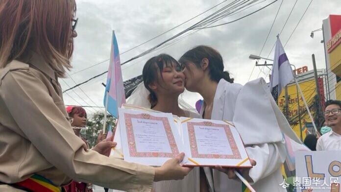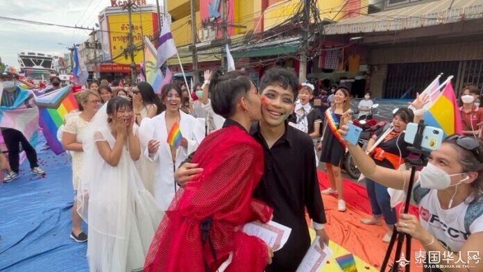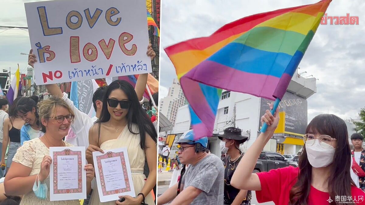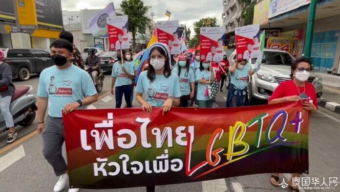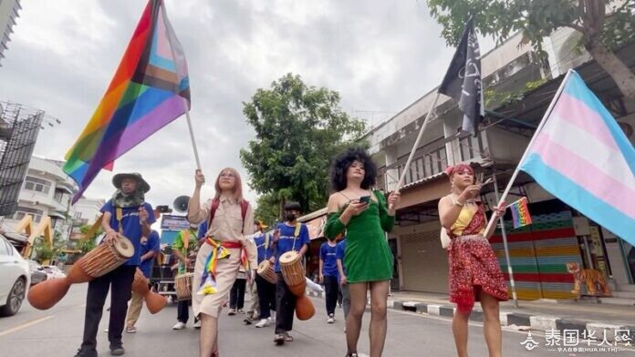 泰国华人网讯 7月2日,在孔敬Srichan路,东北部性少数团体和当地各群众团体共同举办游行活动,以支持《婚姻平权法》草案和《伴侣法》草案。在游行中,LGBTQ+人士高举彩虹旗,沿路举行各种活动。