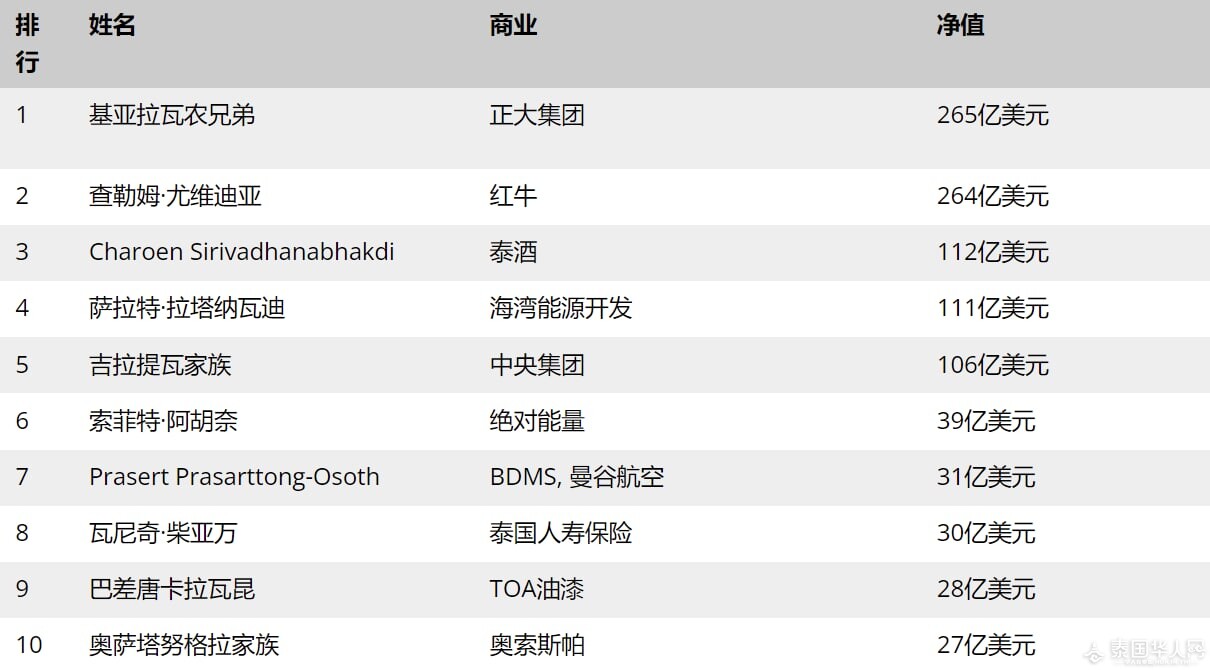 在《福布斯》亚洲版公布的最新泰国富翁排行榜,前10位的榜单排名与上一年基本保持不变。正大集团旗下的 谢国民家族(Chiaravanont) 今年财富缩水近 37 亿美元,但仍以 265 亿美元的净资产位居泰国首富。