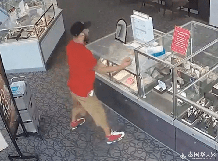 美国一名男子用砖头多次猛砸珠宝柜(视频截图) 这段摄于6月初的监控视频显示,该男子于下午1时左右进入珠宝店,随后从兜里掏出一块砖头,不断用它猛砸珠宝柜,前后共计猛击了柜台9次。在猛砸珠宝柜的过程中,他还一度停下来戴墨镜,以掩饰自己的身份。