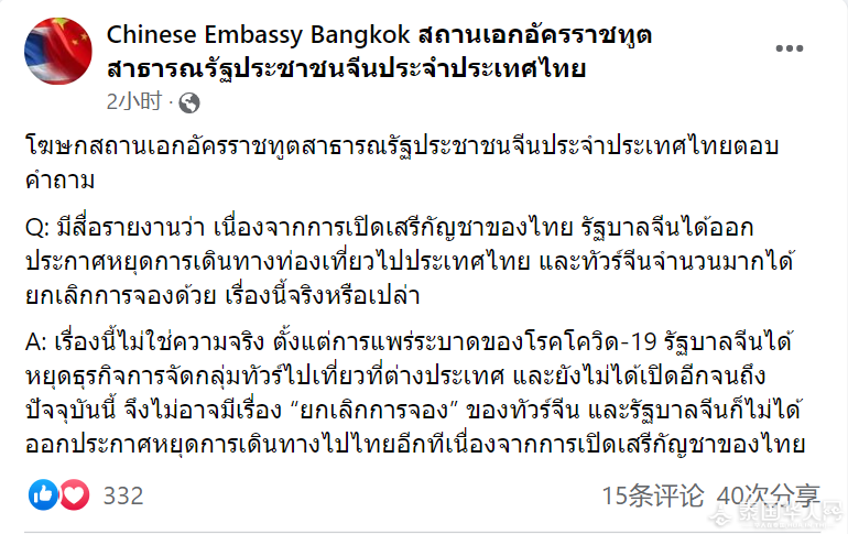 泰国华人网讯 7月19日,中国驻泰国大使馆在官方脸书上发布消息,回答相关提问: 问:有关报道称,泰国宣布大麻合法化后,中国政府发布公告提醒公民勿赴泰旅游,且许多中国旅游团也因此取消了行程,此事是否属实? 答:不属实。自新冠肺炎疫情爆发以来,中国政府就停止组团出国旅游,至今尚未开放,因此不存在“取消行程”的说法。且泰国宣布大麻合法化后,中国政府也并未发布停止公民赴泰旅游的公告。