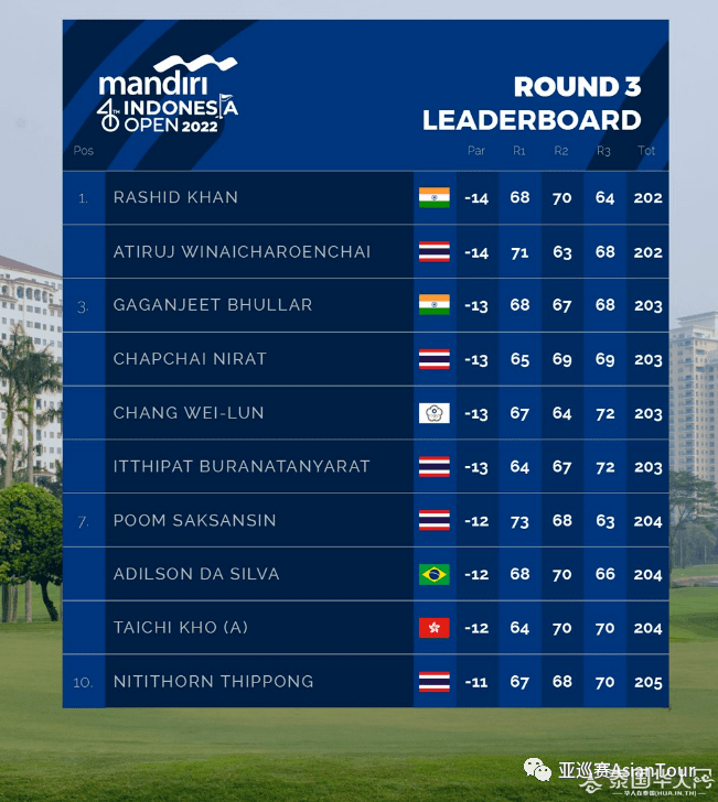 (亚巡赛AsianTour/图文)印度球手卡汉(Rashid Khan)和泰国球手阿提鲁-威奈查隆差(Atiruj Winaicharoenchai)今天在印尼雅加达潘多克因达高尔夫球场(Pondok Indah Golf Course)以一杆优势夺得总奖金为50万美元的亚巡赛-曼迪利银行印尼公开赛第三轮的并列领先,而19岁的中国小将陈顾新早上在第二轮的补赛中未能力挽狂澜,以两杆之差被淘汰出局。 24位球手在今天早上6点20分进行第二轮的补赛,其中就包括了剩下三洞待打的陈顾新。最终,陈顾新连续第二轮打出平标准杆72杆,以144杆(平标准杆)的总成绩位于并列第88位,以两杆之差无缘决赛。