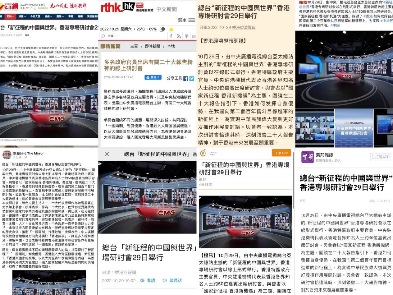 泰国华人网讯 据央视新闻报道, 10月29日,由中央广播电视总台亚太总站主办的“新征程的中国与世界”香港专场研讨会以线上形式举行。香港特区政府主要官员、中央驻港机构代表及香港各界知名人士等50余位嘉宾出席研讨会。与会者以“国家新征程 香港新机遇”为主题,探讨在中共二十大报告引领下,香港如何发挥自身优势,为实现中华民族伟大复兴更好发挥作用展开讨论。与会者一致认为,本次研讨会恰逢其时,深刻领会学习中共二十大精神,对于香港未来发展至关重要。